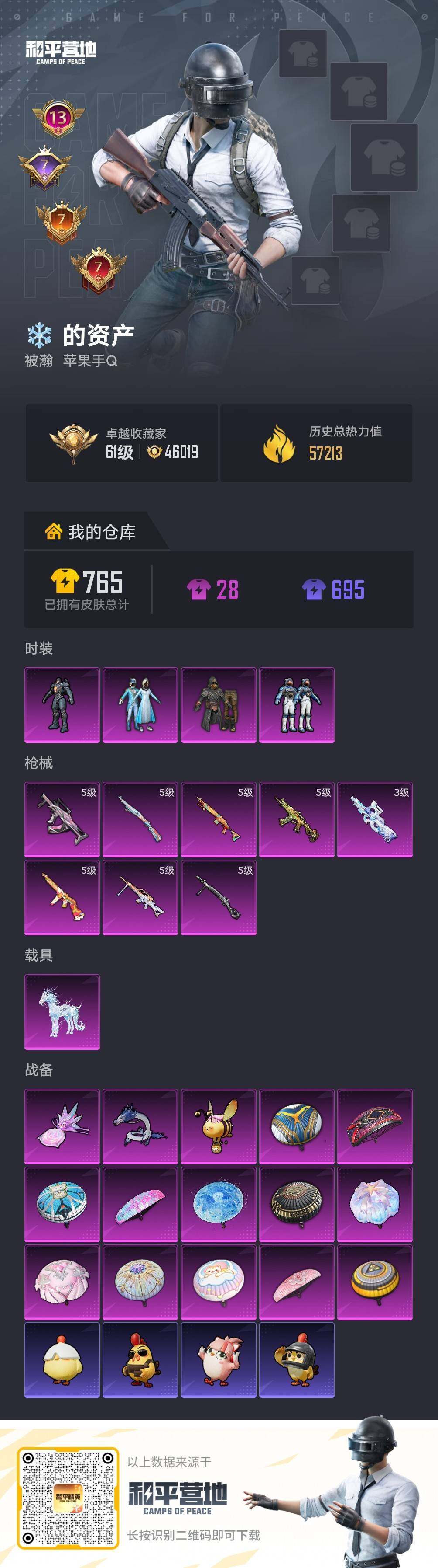 无敌战神框-4粉装-8特效枪-1载具-3粉色飞行器-57213热力值-13王牌印记-146套装-201枪皮