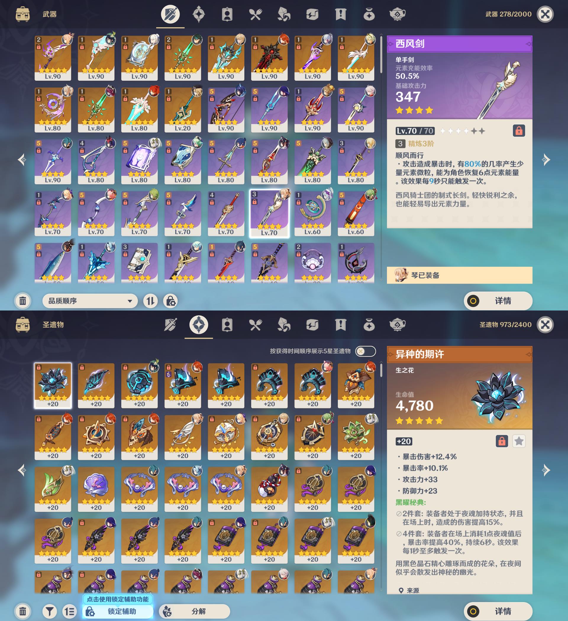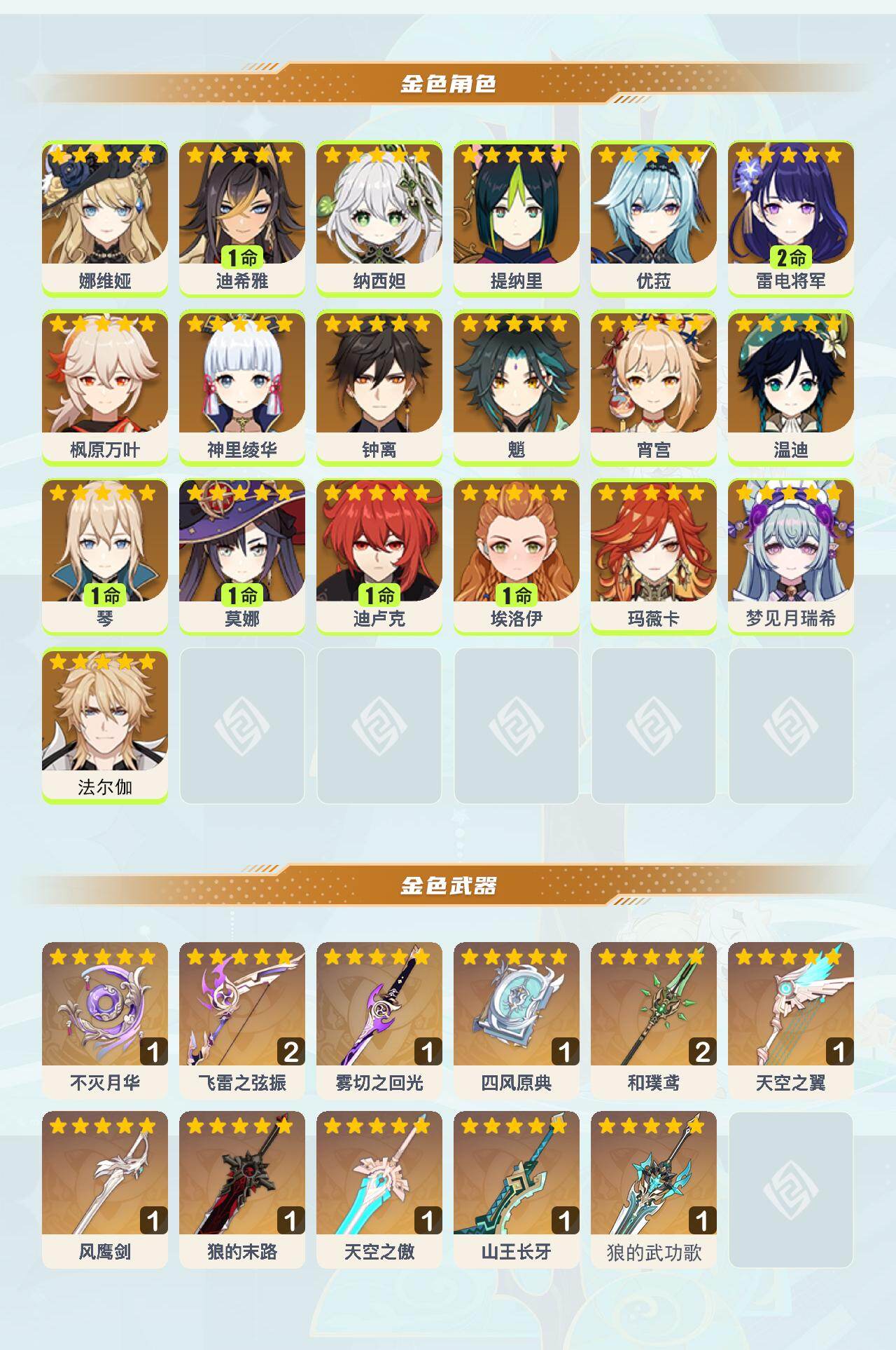 59级/39黄/女主/19个五星角色/12个五星武器/温迪/