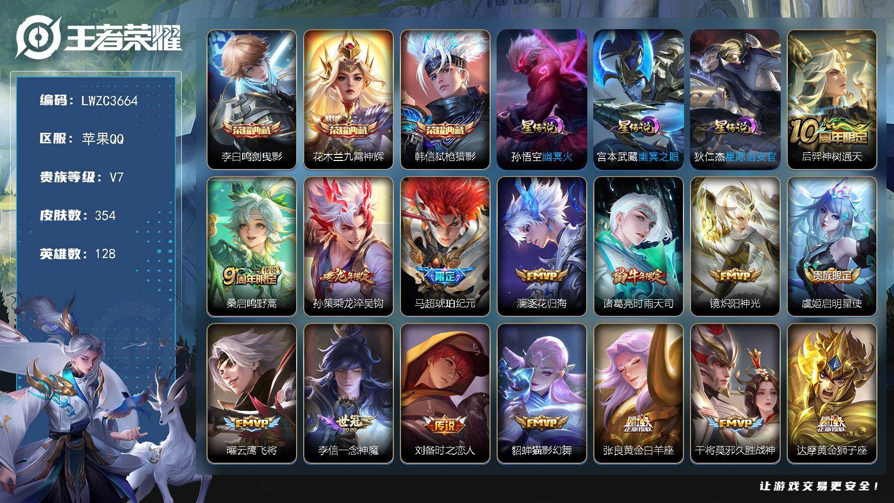 【特价急出/详情看图】苹果Q-V7-最强王者段位-128英雄-354皮肤-3典藏皮肤-3星元-19传说-110史诗【英雄全皮】:刘邦全皮,孙权全皮,鬼谷子全皮,敖隐全皮,空空儿全皮,影全皮【荣耀典藏】:李白鸣剑曳影,花木兰九霄神辉,韩信弑枪猎影【传说皮肤】:后羿神树通天,桑启鸣野蒿,孙策乘龙淬吴钩,马超琥珀纪元,澜逐花归海,诸葛亮时雨天司,镜炽阳神光,虞姬启明星使,曜云鹰飞将,李信一念神魔,刘备时之恋人,貂蝉猫影幻舞,张良黄金白羊座,干将莫邪久胜战神,达摩黄金狮子座,花木兰冠军飞将,宫本武藏地狱