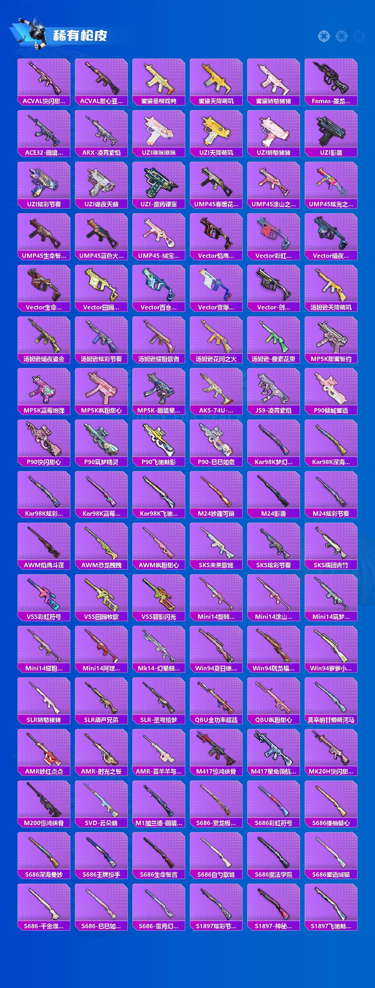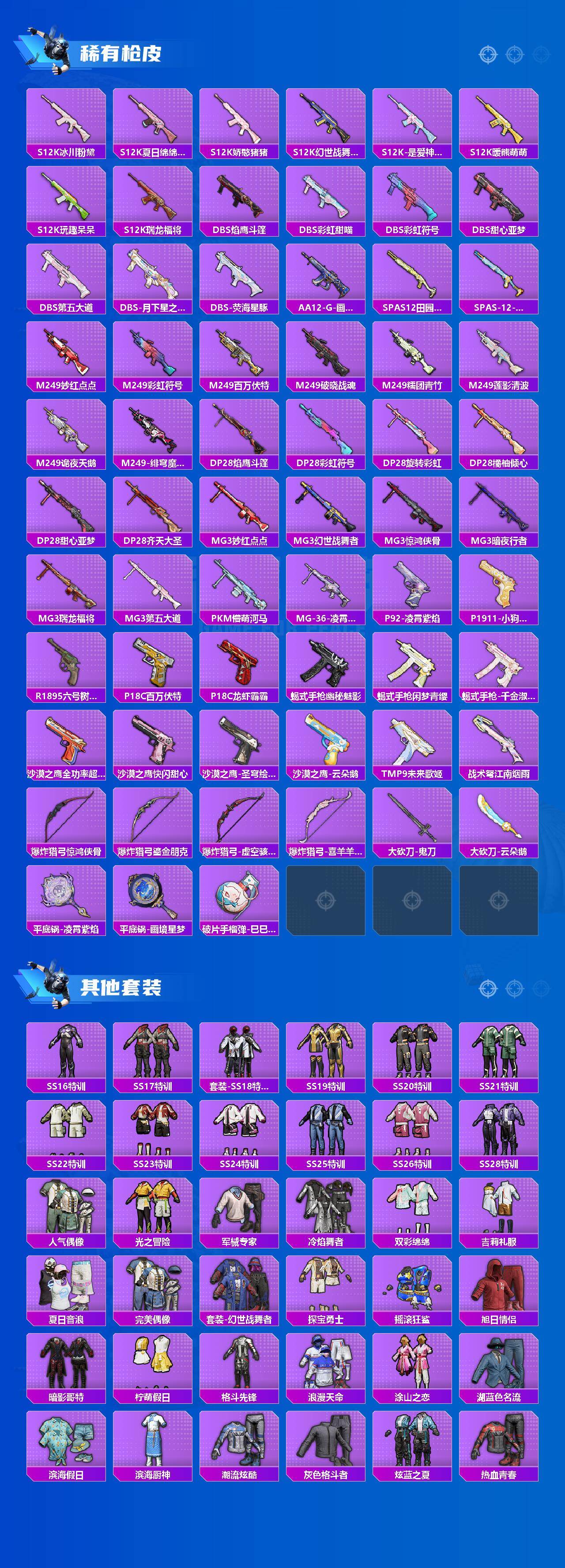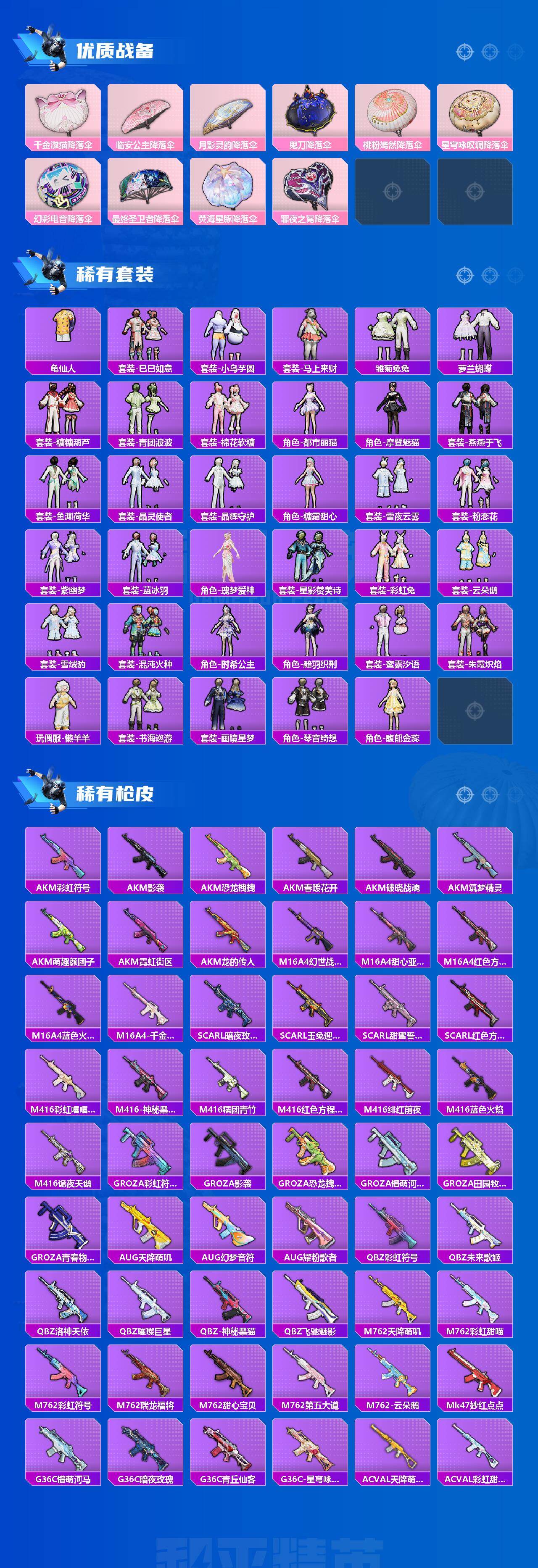 粉装28/粉枪9/载具1/珍稀飞行器72301,,/套装277/枪皮350/热力值/历史最高段位:王牌印记18次/Lv:69/五级SCAR-L-锦绣绵绵/七级M416-心之恋语/七级GROZA-香水柠檬/三级GROZA-精灵之光/七级UMP45-恐龙拽拽/七级Kar98K-未来歌姬/五级Kar98K-巳巳如意/五级Mk14-福马献瑞/七级M249-彩虹甜喵/