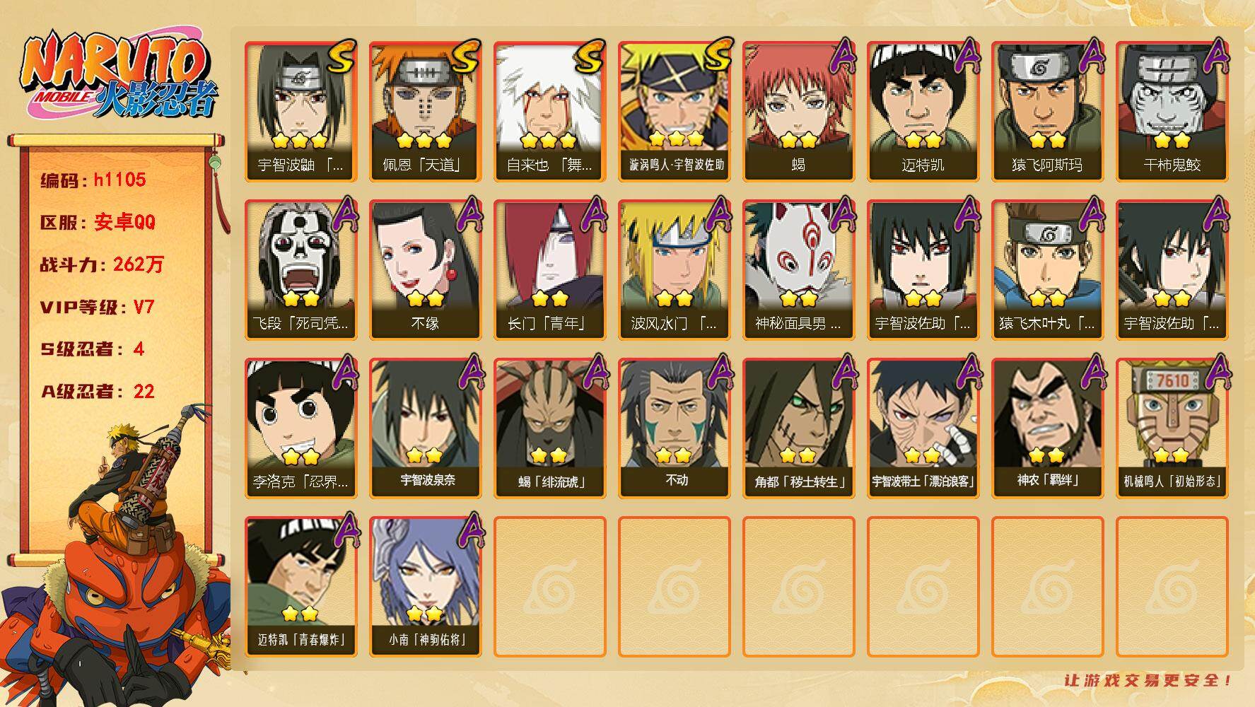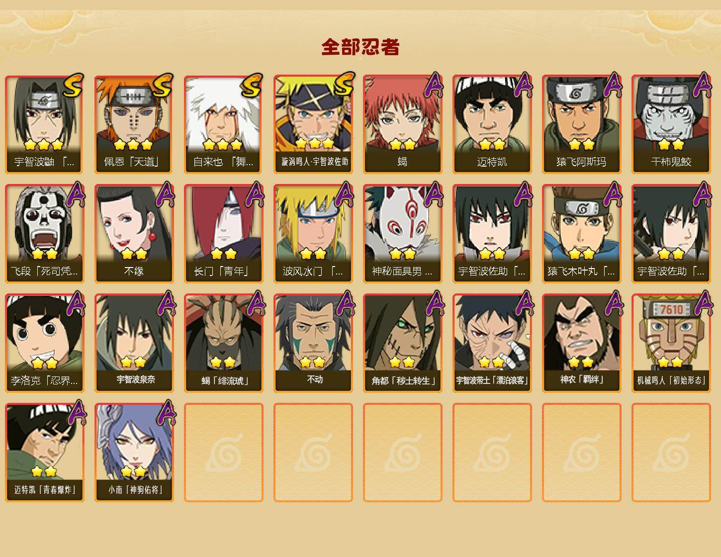 4S级忍者数-22A级忍者数【S级忍者】:宇智波鼬「须佐能乎」(3星),自来也「舞之豪杰」(3星),佩恩「天道」(3星),漩涡鸣人·宇智波佐助(3星)【A级忍者】:长门「青年」(2星),波风水门「青年」(2星),飞段「死司凭血」(2星),干柿鬼鲛(2星),机械鸣人「初始形态」(2星),迈特凯(2星),蝎(2星),蝎「绯流琥」(2星),小南「神驹佑将」(2星),角都「秽土转生」(2星),猿飞阿斯玛(2星),宇智波佐助「须佐能乎」(2星),宇智波佐助「万花筒写轮眼」(2星),宇智波带土「漂泊浪客」(