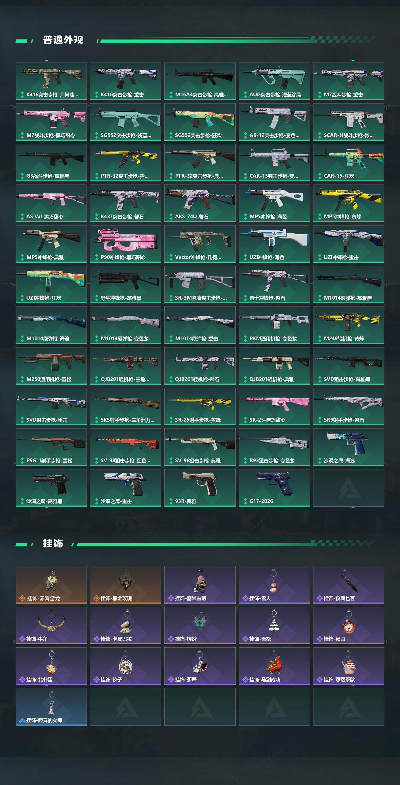 【传说外观】:AKM突击步枪-锦绣,K416突击步枪-行动记录,AUG突击步枪-悠然茶歇,SG552突击步枪-运动员,SCAR-H战斗步枪-水墨云图,SCAR-H战斗步枪-荼蘼,腾龙突击步枪-马年祥瑞,K437突击步