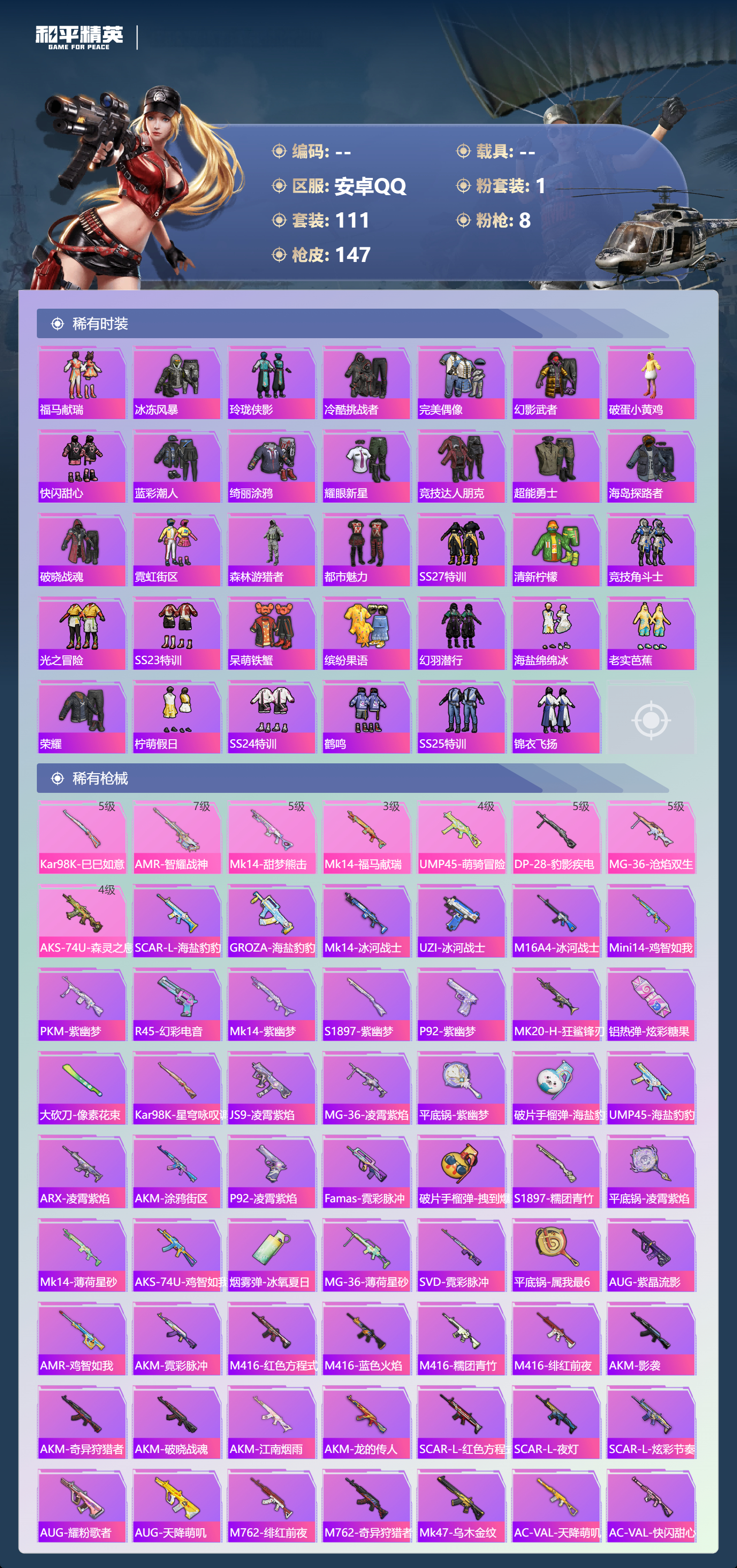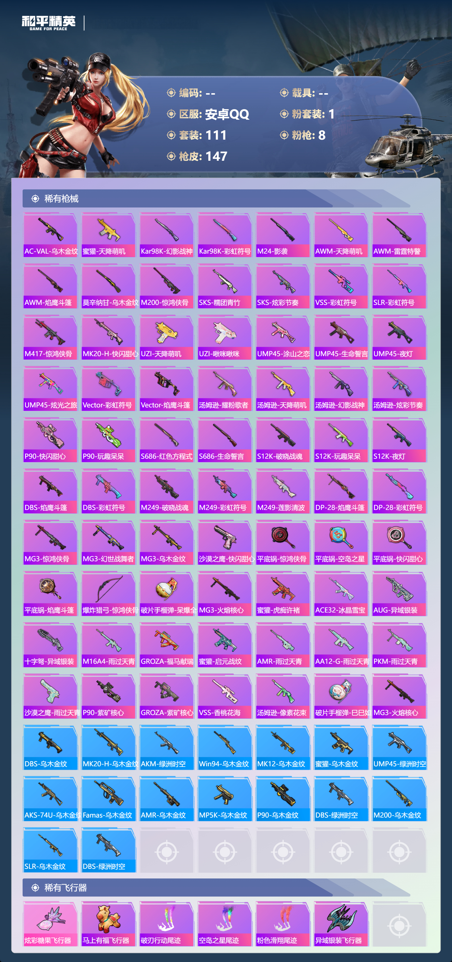 安卓手Q-7王牌印记-1粉装-8特效枪-38271热力值-111套装-147枪皮