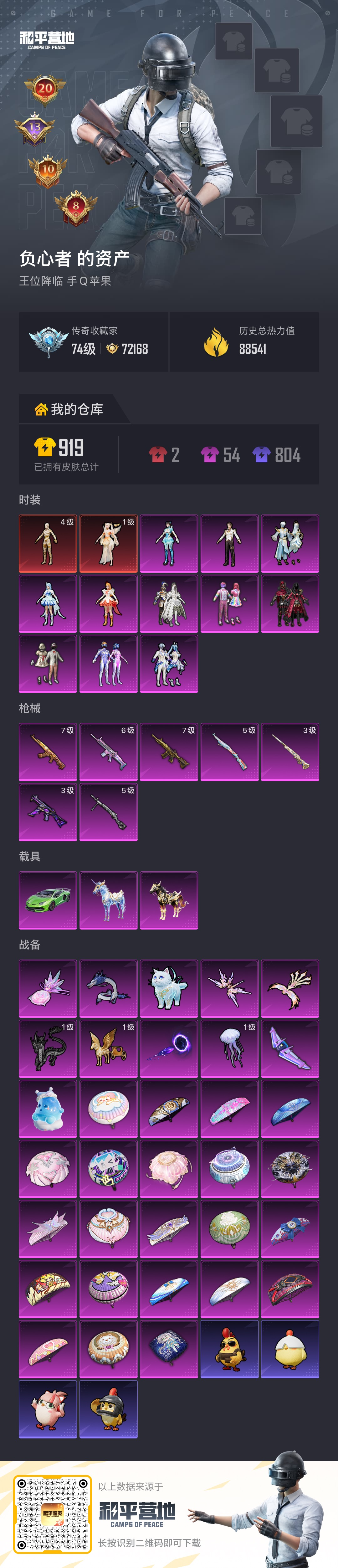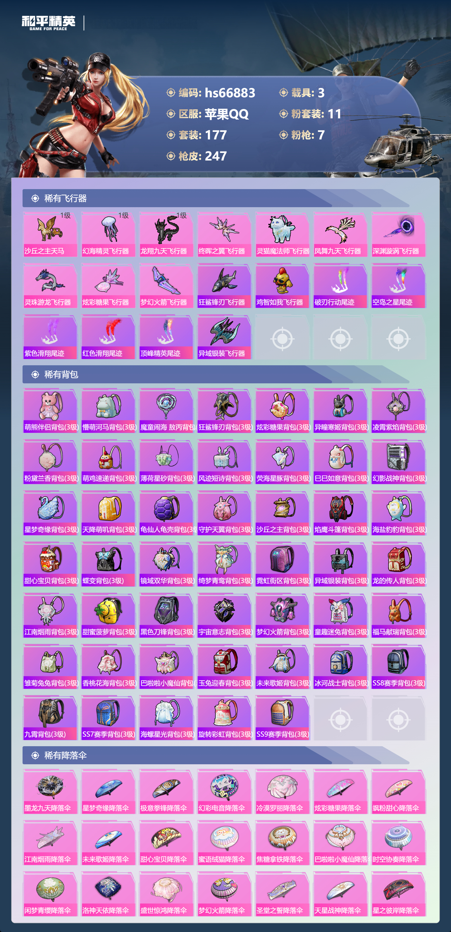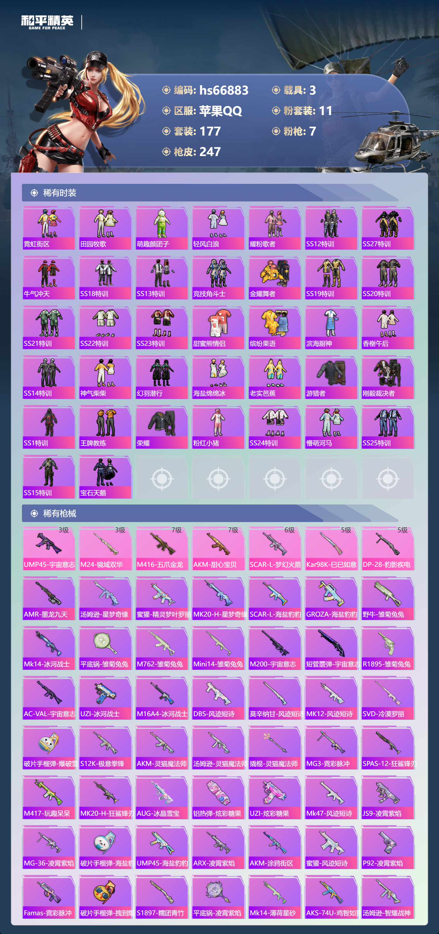 苹果手Q-20王牌印记-有战神框-2红装-11粉装-7特效枪-3
