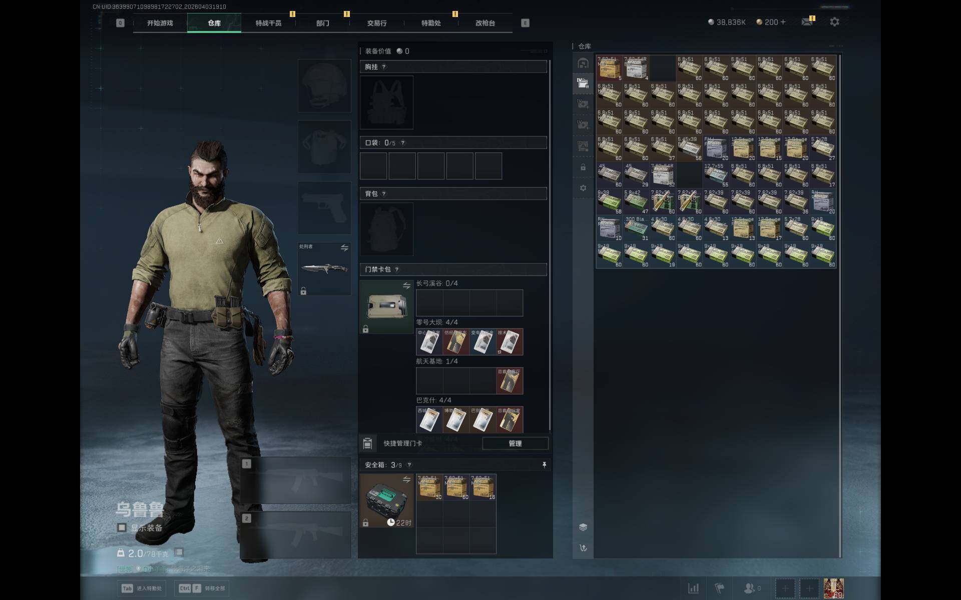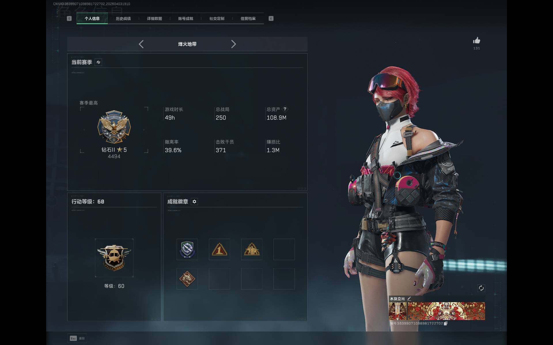 总资产(M):108M/哈夫币(K):38836K/传说枪皮数:22/全面战场等级:23_段位:列兵/烽火地带等级:60_段位:钻石/露娜-黑·天际线/蛊-能天使午夜邮差/近战-处刑者2级/近战-黑鹰