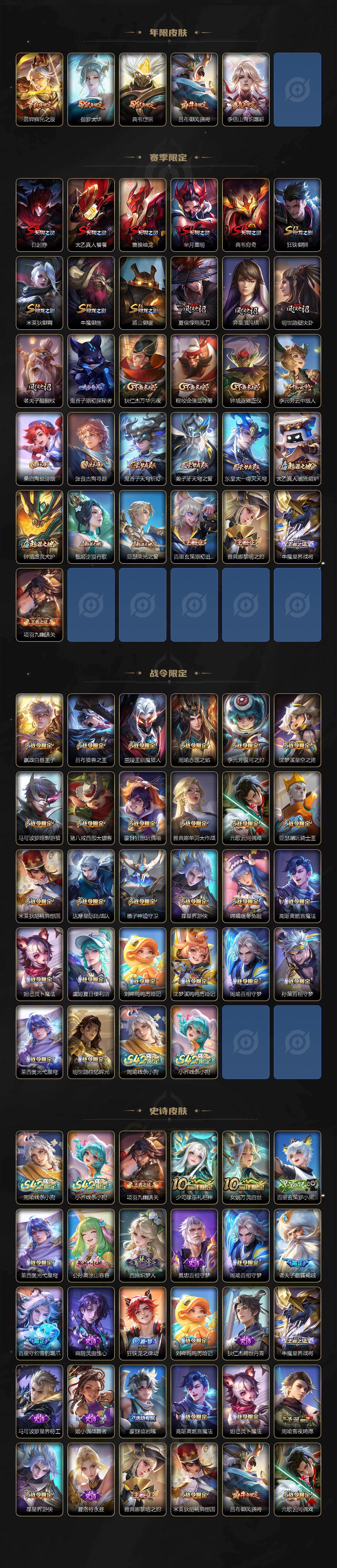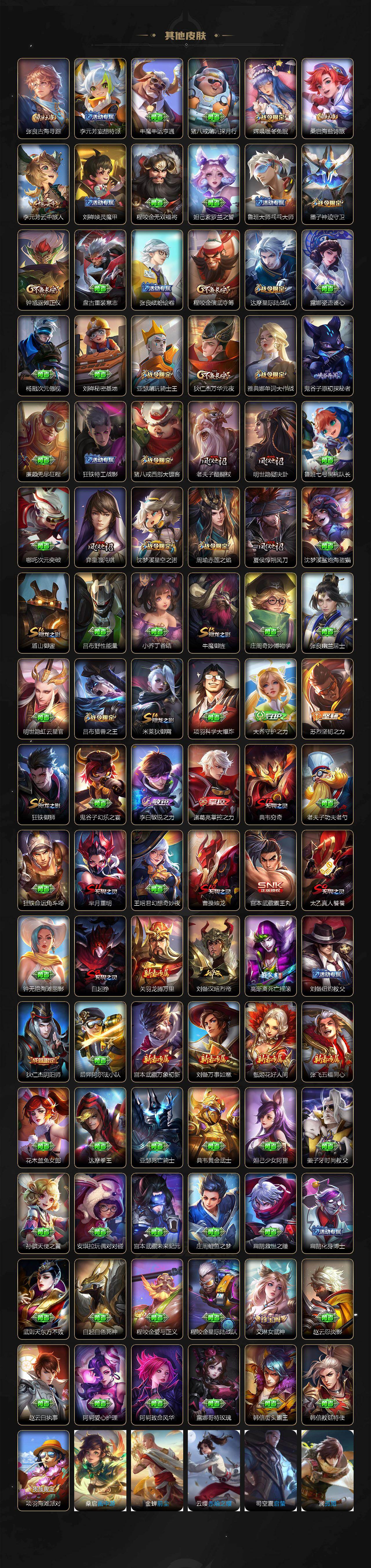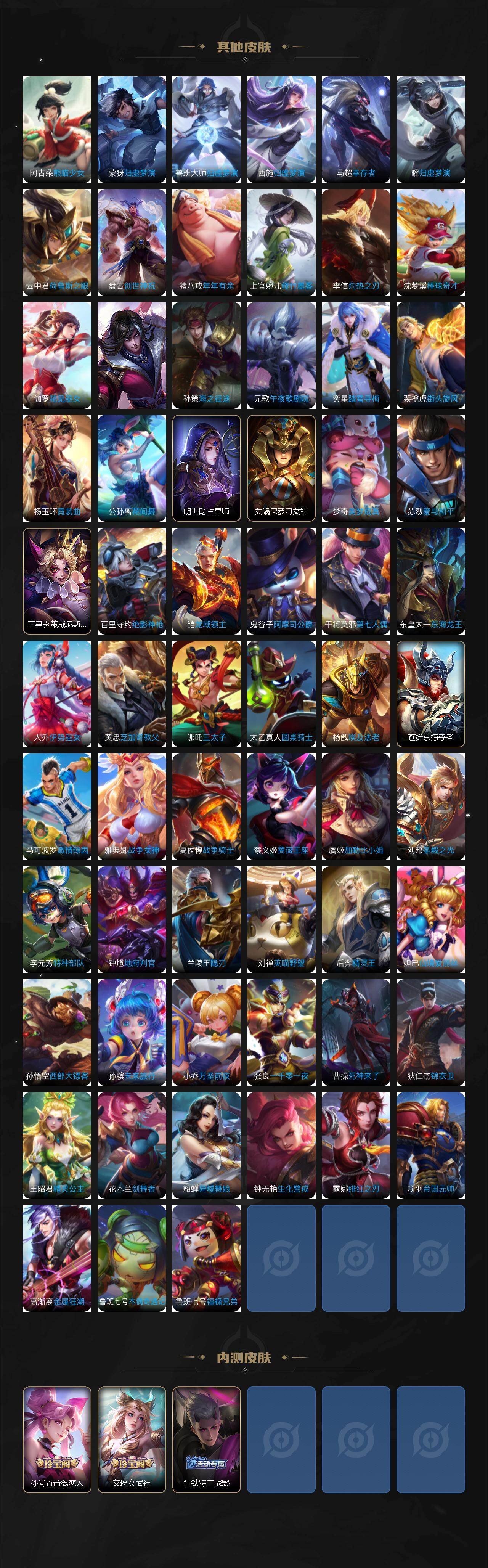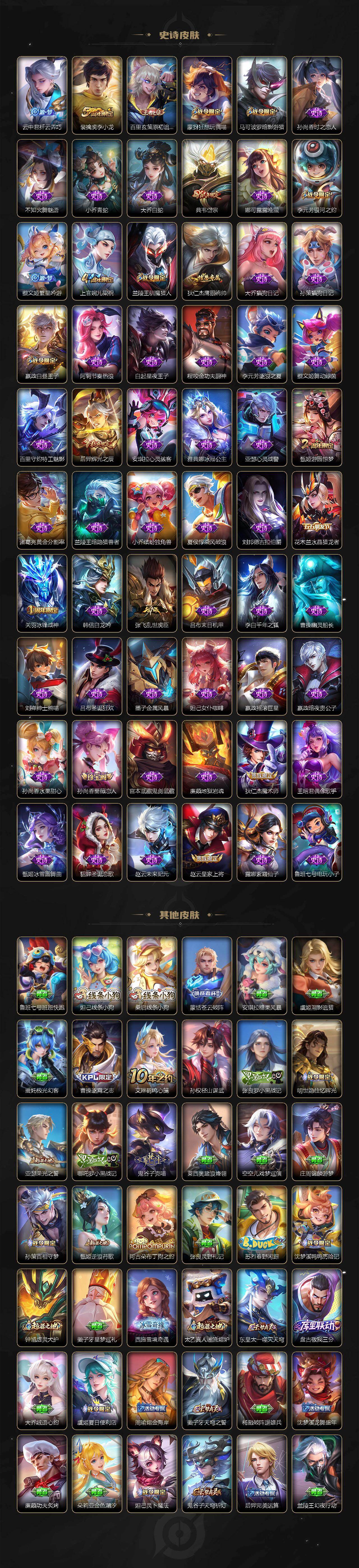 张飞兔狲蓬尾/后羿神树通天/桑启-鸣野蒿/李信-山海·炽霜斩/虞姬-启明星使/孙悟空-零号·赤焰/刘备-时之恋人/伽罗-太华/孙尚香-末日机甲/孙悟空-地狱火/白起-狰/蒙犽-顽岩魄/大乔-绒语心约/虞姬-夏日便利店/姜子牙-天穹之誓/杨戬-破阵·退雄兵/狄仁杰-阴阳师/赵云-皇家上将/墨子-神迹守卫/嬴政-白昼王子/孙尚香-蔷薇恋人/高渐离-死亡摇滚/芈月-重明/吕布-猎兽之王/吕布-御风骁将/