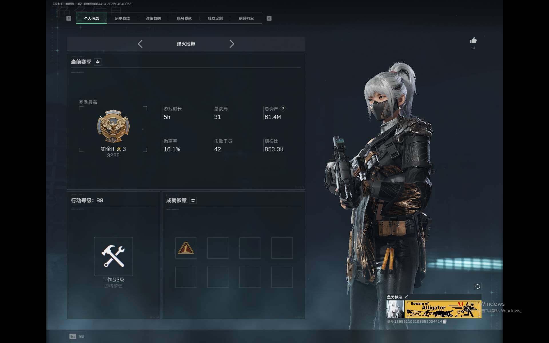 61m总资产-47877k哈夫币-38烽火等级-铂金-9战场等级-列兵【干员