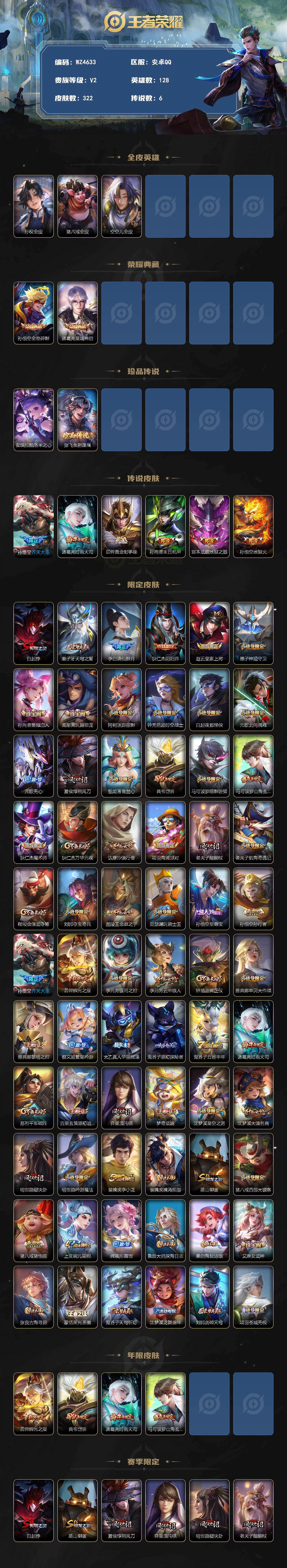 皮肤322/典藏2/传说6/史诗90/英雄128/孙权全皮/猪八戒全皮/空空儿全皮/孙悟空-全息碎影/诸葛亮-星域神启/