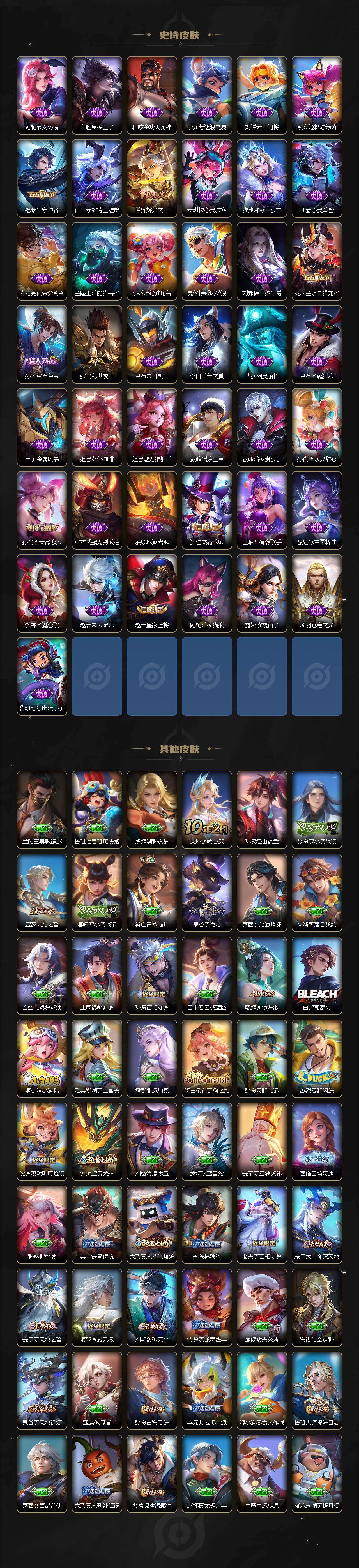 安琪拉酷洛米之心/张飞兔狲蓬尾/孙悟空-齐天大圣/诸葛亮-时雨天司/后羿-黄金射手座/孙尚香-末日机甲/宫本武藏-地狱之眼/孙悟空-地狱火/白起-狰/姜子牙-天穹之誓/李白-谪仙醉月/狄仁杰-阴阳师/赵云-皇家上将/墨子-神迹守卫/孙尚香-蔷薇恋人/高渐离-玩趣恶龙/阿轲-迷踪丽影/钟无艳-超时空战士/白起-夜都怪侠/元歌-云间偶戏/元歌-无心/夏侯惇-朔风刀/甄姬-落雪兰心/典韦-岱宗/
