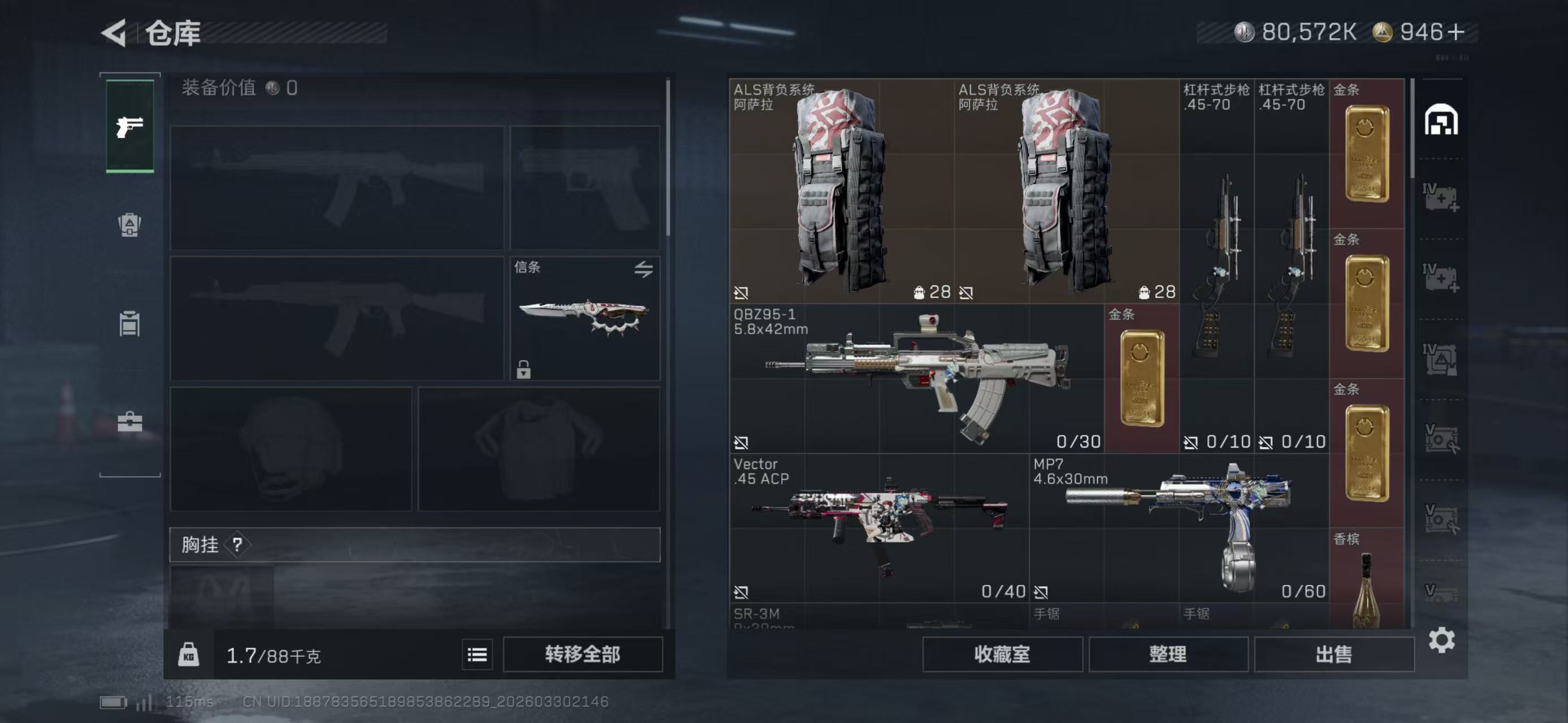 总资产414.29M,哈夫币 80572.83K,战场等级:50 尉官,行动等级:60 钻石,角色皮肤6,枪皮数量119【特战干员外观】乌鲁鲁-荒原猎手,蛊-能天使·午夜邮差,蛊-不羁人生,蜂医-送葬人·无题密令,红狼-电锯惊魂,露娜-金牌射手,【近战】近战-处刑者,近战-信条,近战-黑鹰,【典藏外观】腾龙突击步枪-檀劫铳影,勇士冲锋枪-檀劫铳影,勇士冲锋枪-檀劫铳影,勇士冲锋枪-檀劫铳影,AS