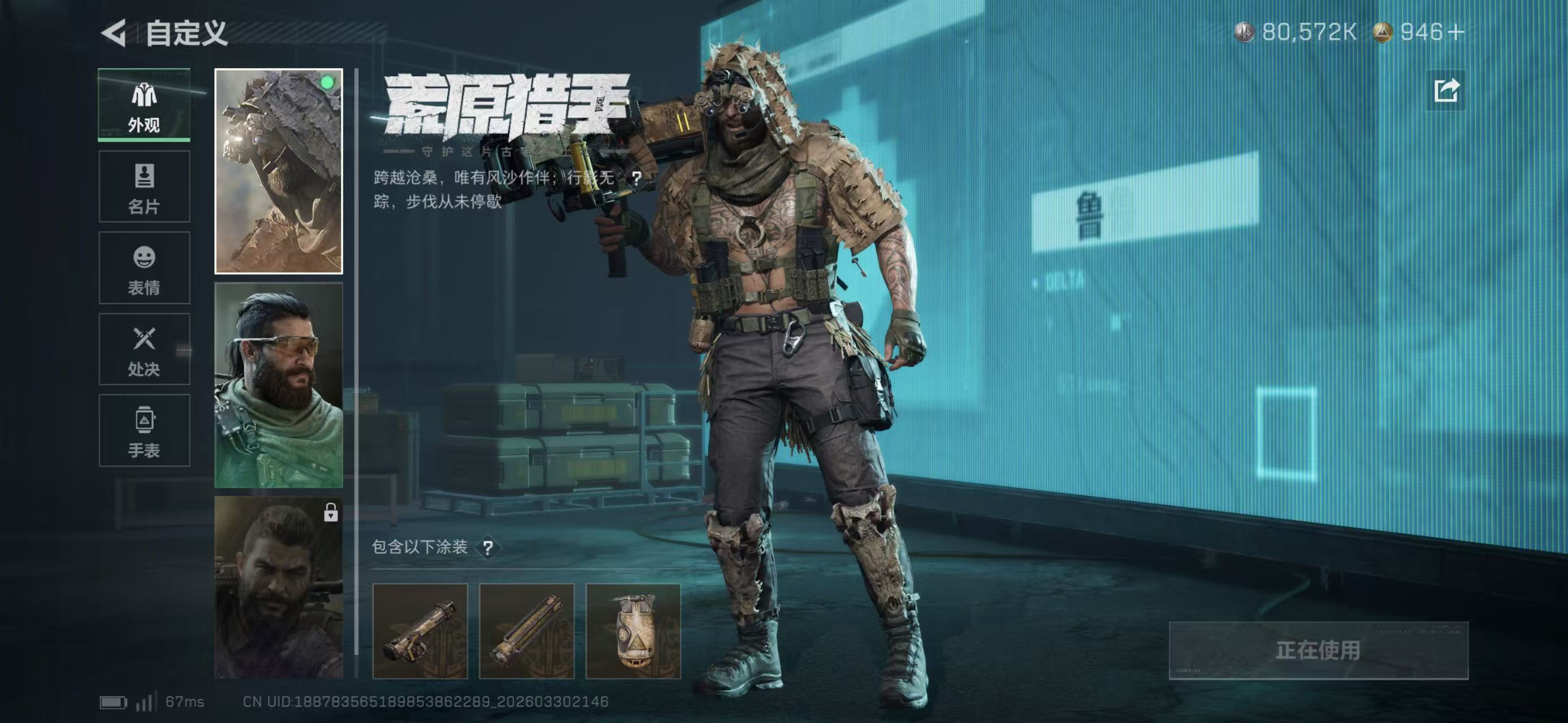总资产414.29M,哈夫币 80572.83K,战场等级:50 尉官,行动等级:60 钻石,角色皮肤6,枪皮数量119