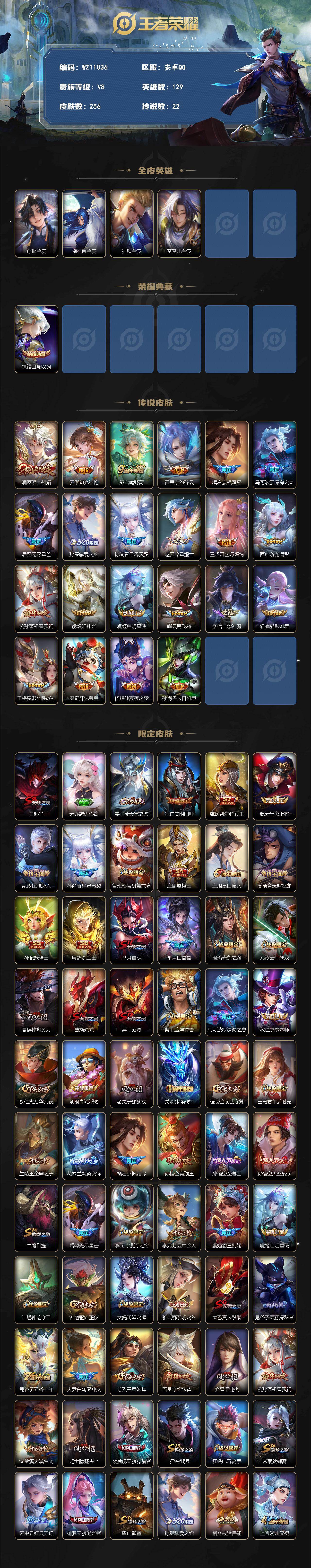 安卓Q-V8-永恒钻石IV段位-129英雄-256皮肤-1典藏皮肤-22传说-66史诗