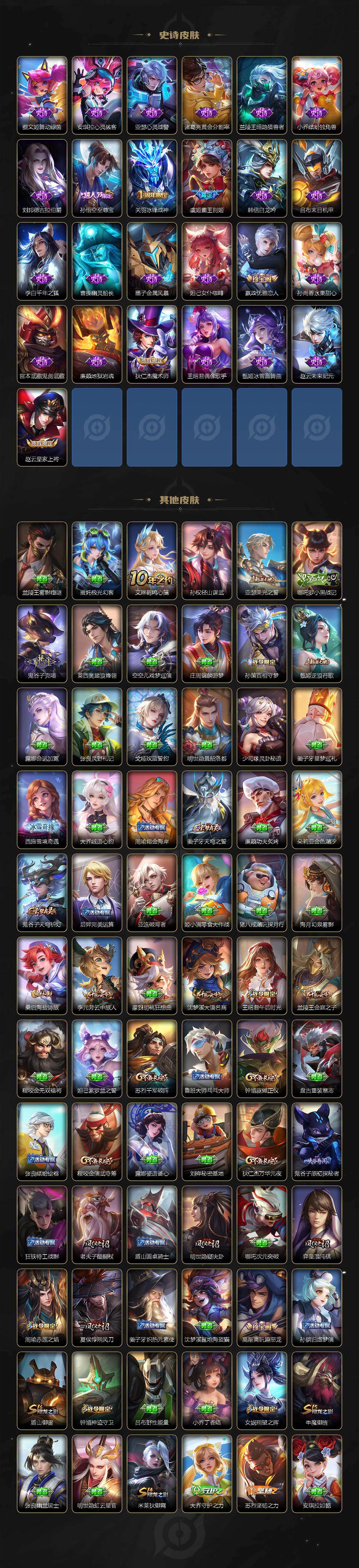 【传说皮肤】:澜愿照九州拓,云缨幻光神枪,桑启鸣野蒿,百里守约碎云,橘右京枫霜尽,马可波罗深海之息,后羿无尽星芒,孙策挚爱之约,孙尚香异界灵契,赵云淬星耀世,王昭君乞巧织情,西施游龙清影,公孙离祈