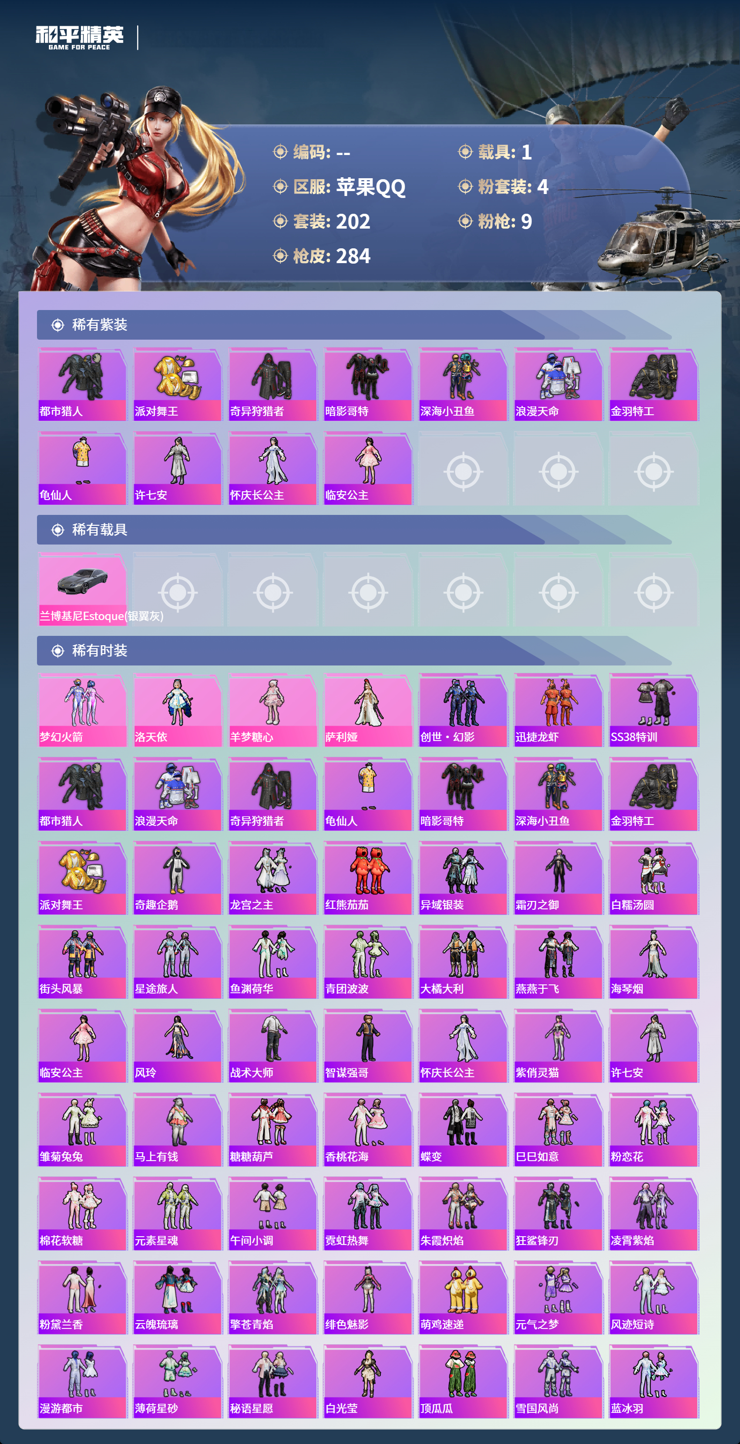 苹果手Q-20王牌印记-4粉装-9特效枪-1载具-82117热力值