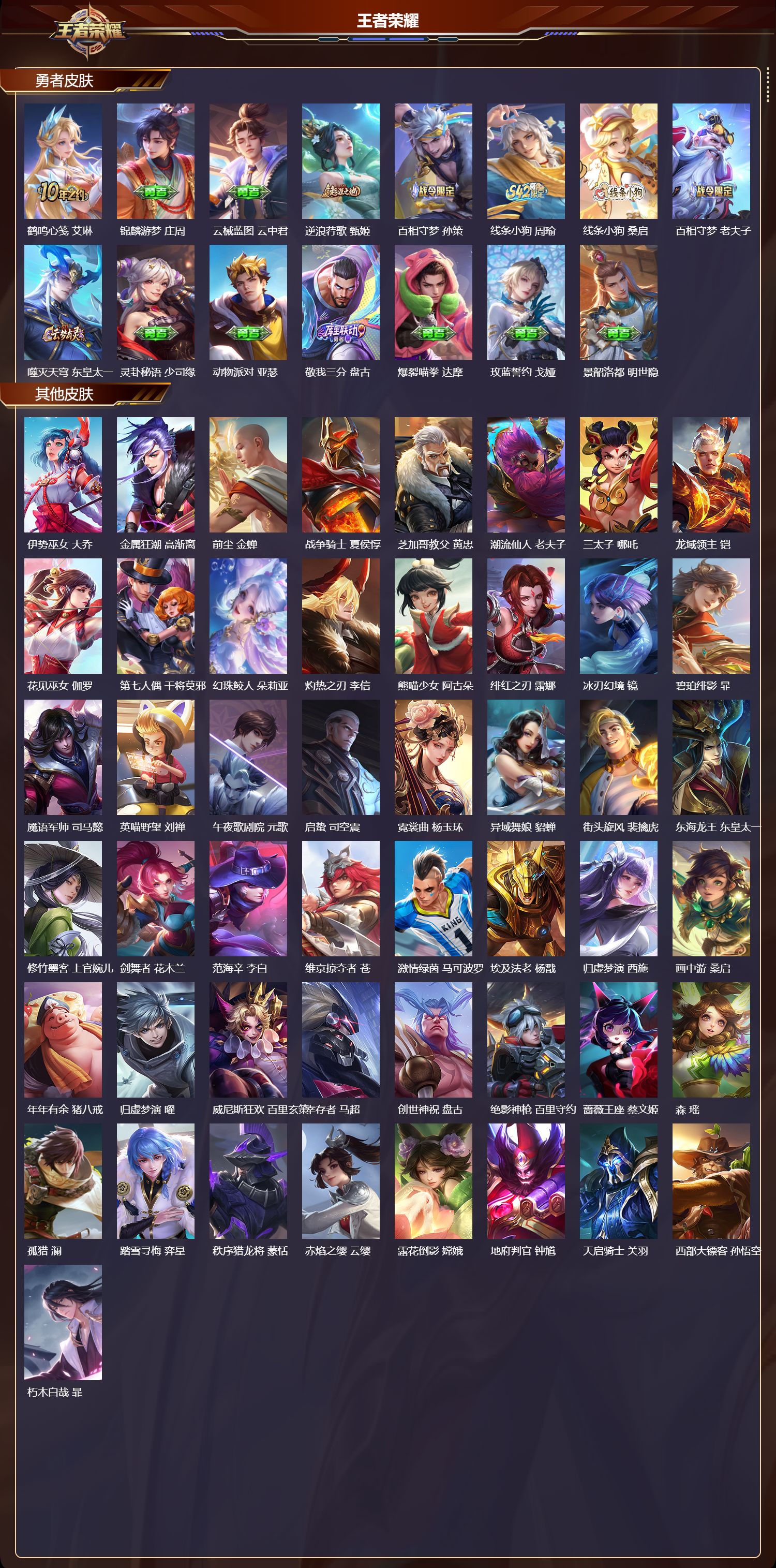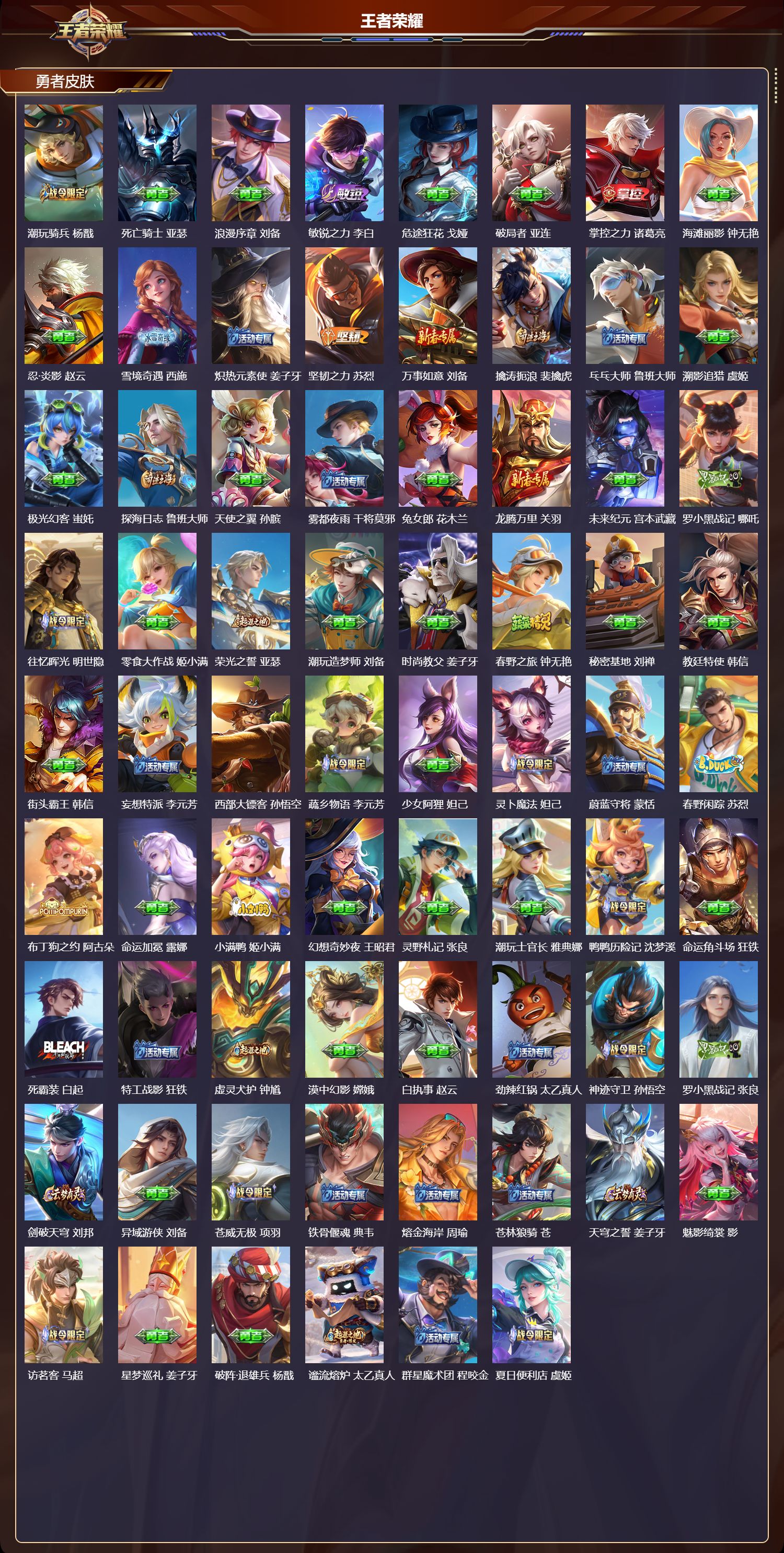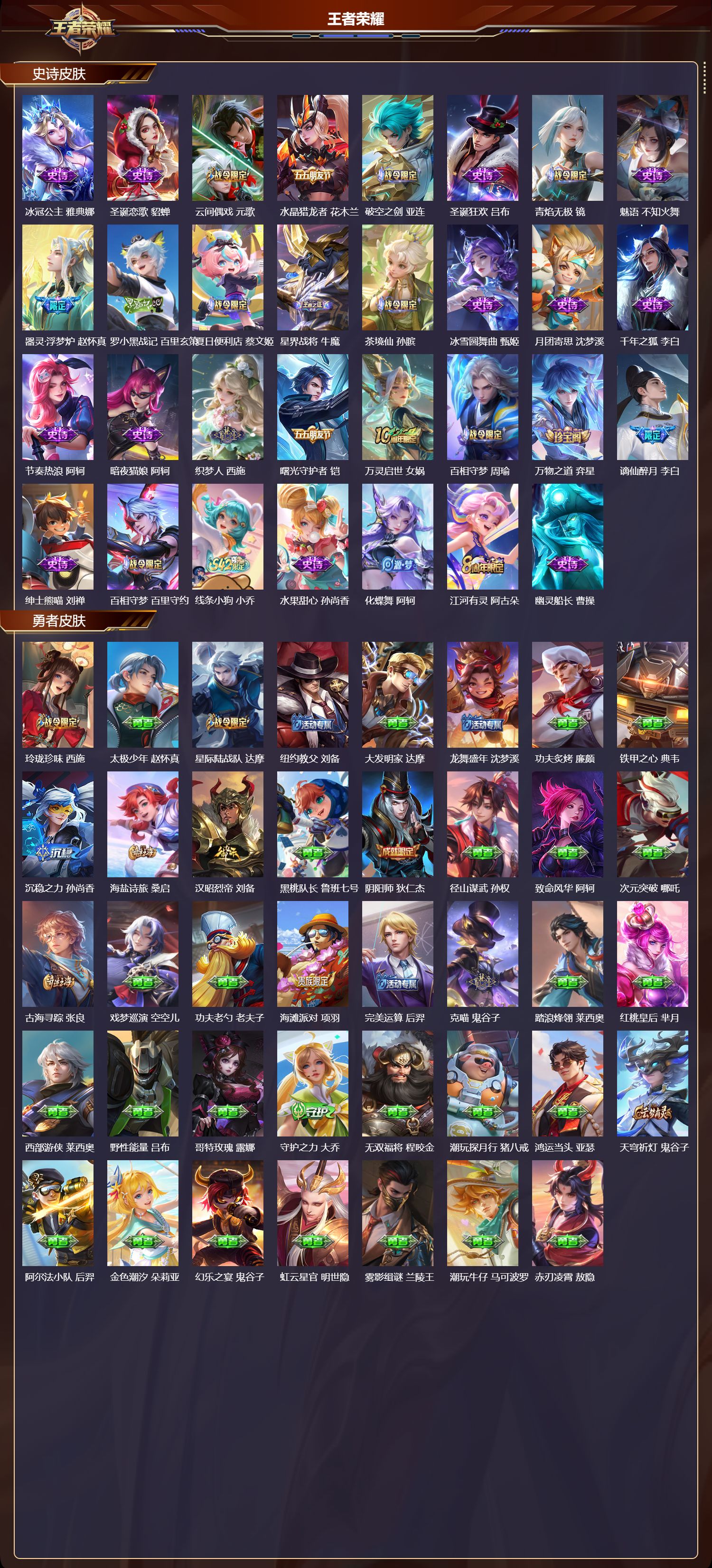 安卓QQ/无双王者/270皮肤/125英雄/1典藏/0珍品无双/2无双/1珍品传说/23传说/74史诗/7稀有英雄【1 珍品传说】朽木白哉 暃,【1 典藏皮肤】鸣剑·曳影 李白,【2 无双皮肤】离恨烟 公孙离,器灵·螭龙剑 曜,【23 传说皮肤】逐花归海 澜,无双飞将 马超,白虎志 百里玄策,九山相柳 司马懿,地狱火 孙悟空,云鹰飞将 曜,凤求凰 李白,燃星之曲 花木兰,灼幽烈阳 东皇太一,落雪白