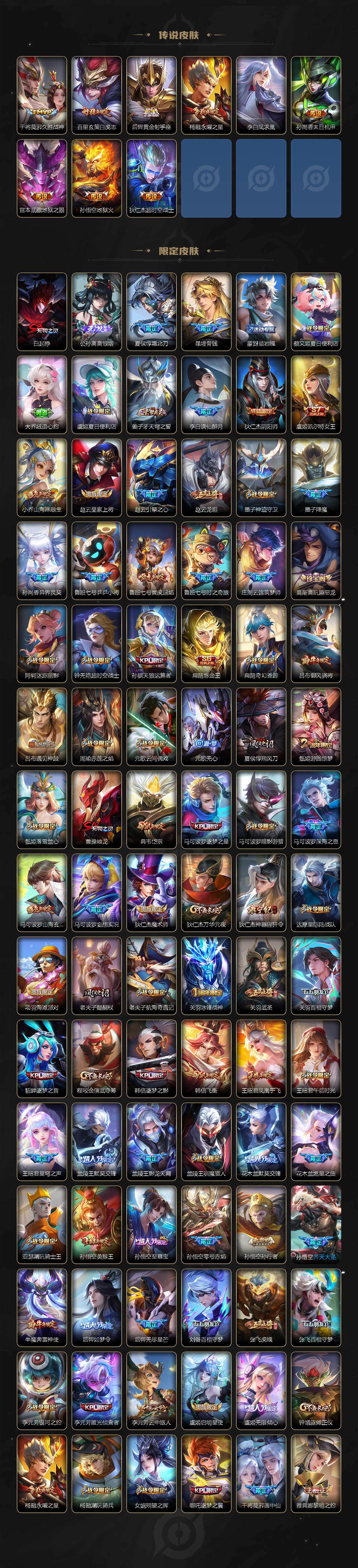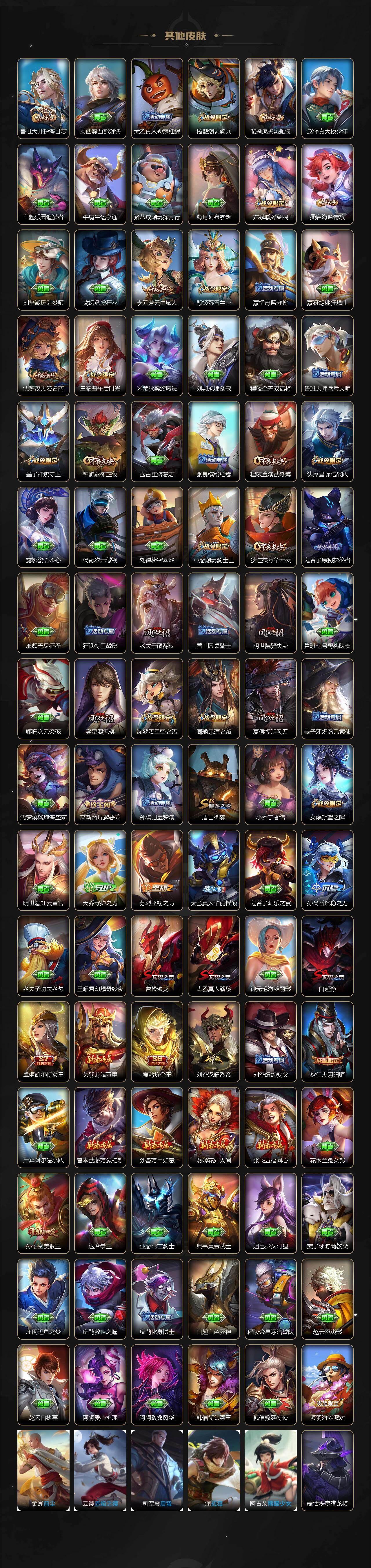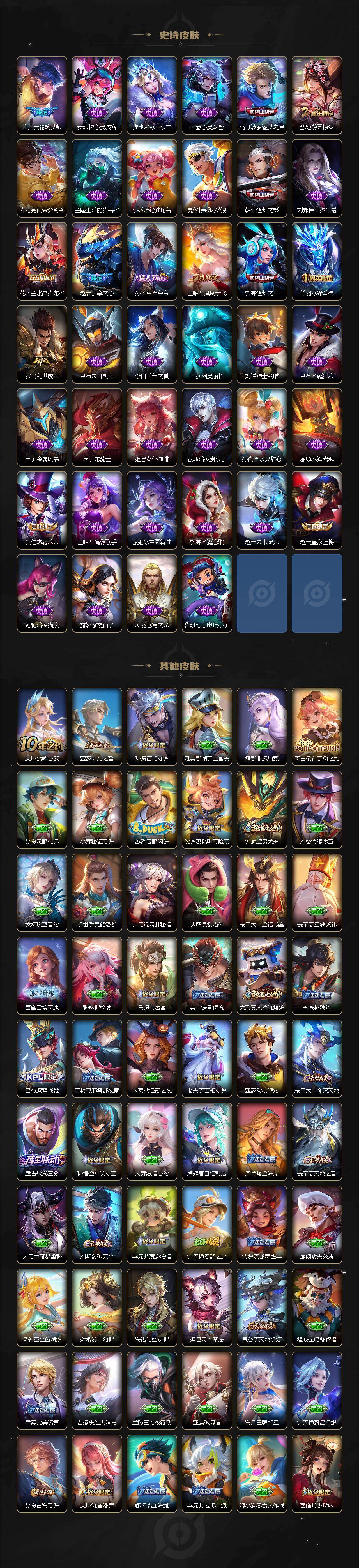 【英雄全皮】:张飞全皮,苍全皮,曜全皮,蒙犽全皮,澜全皮,阿古朵全皮,司空震全皮,金蝉全皮,赵怀真全皮,戈娅全皮,少司缘全皮
