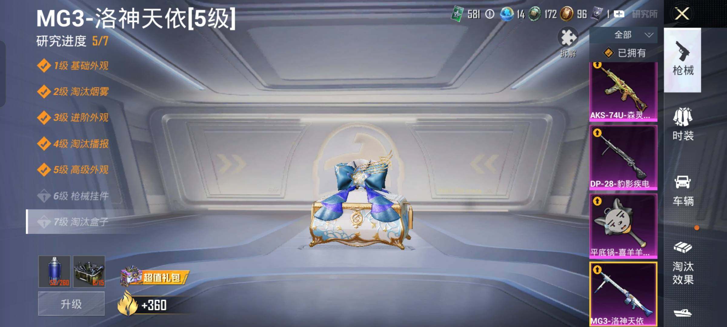 【8特效枪】 AKS-74U-森灵之息 (4级) DP-28-豹影疾电 (5级) MG3-洛神天依 (5级) Mk14-福马献瑞 (5级) AA12-G-萌骑幻想 (4级) UMP45-萌骑冒险 (2级) ACE32-萌