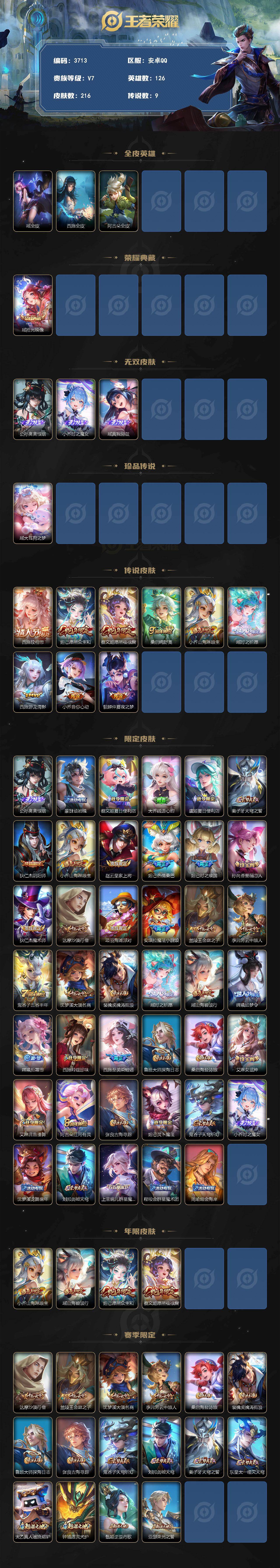 【3713】wj【女号,全皮瑶,紫瑶】安卓Q-V7-最强王者段位-126英雄-216皮肤-1典藏皮肤-3无双-1珍品传说-9传说-67史诗