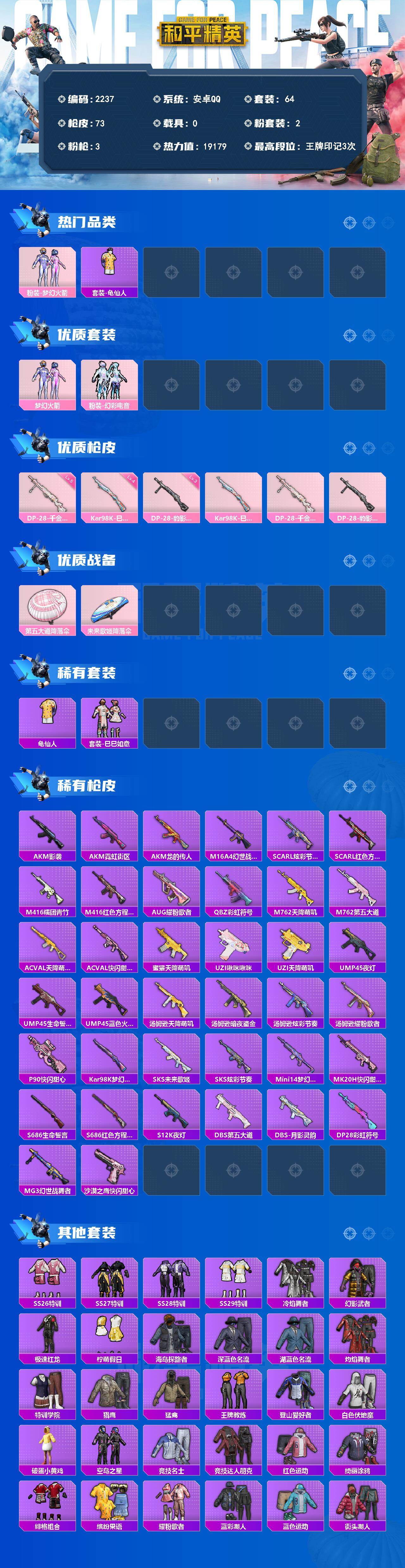 【2237】wj【小身法号,秒换绑】安卓 手Q-2粉装-3特效枪-0载具-0粉色飞行器-19179热力值-3王牌印记-64套装-73枪皮