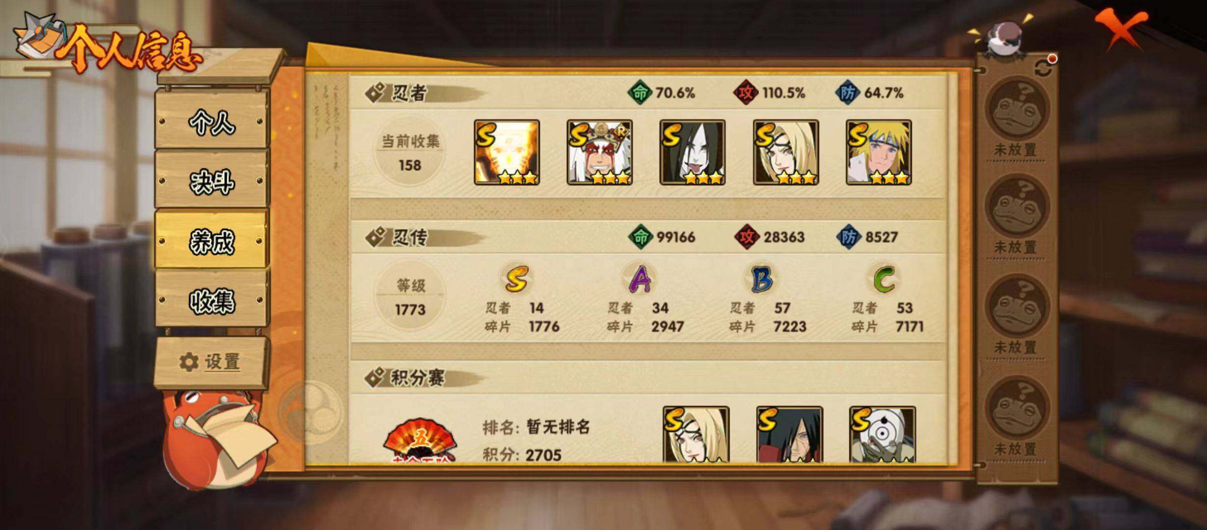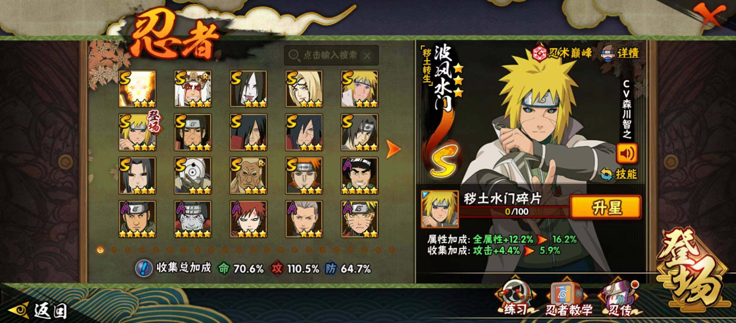 可改实名*14S级忍者数-34A级忍者数【S级忍者】:波风水门「秽土转生」(3星),千手柱间「秽土转生」(3星),宇智波鼬「秽土转生」(3星),宇智波斑「秽土转生」(3星),宇智波斑「秽土转生·解」(3星),宇智波鼬「须佐能乎」(3星),艾「三代目雷影」(3星),自来也「舞之豪杰」(3星),大蛇丸(3星),纲手「百豪」(3星),波风水门(3星),漩涡鸣人「九喇嘛连结」(3星),佩恩「天道」(3星