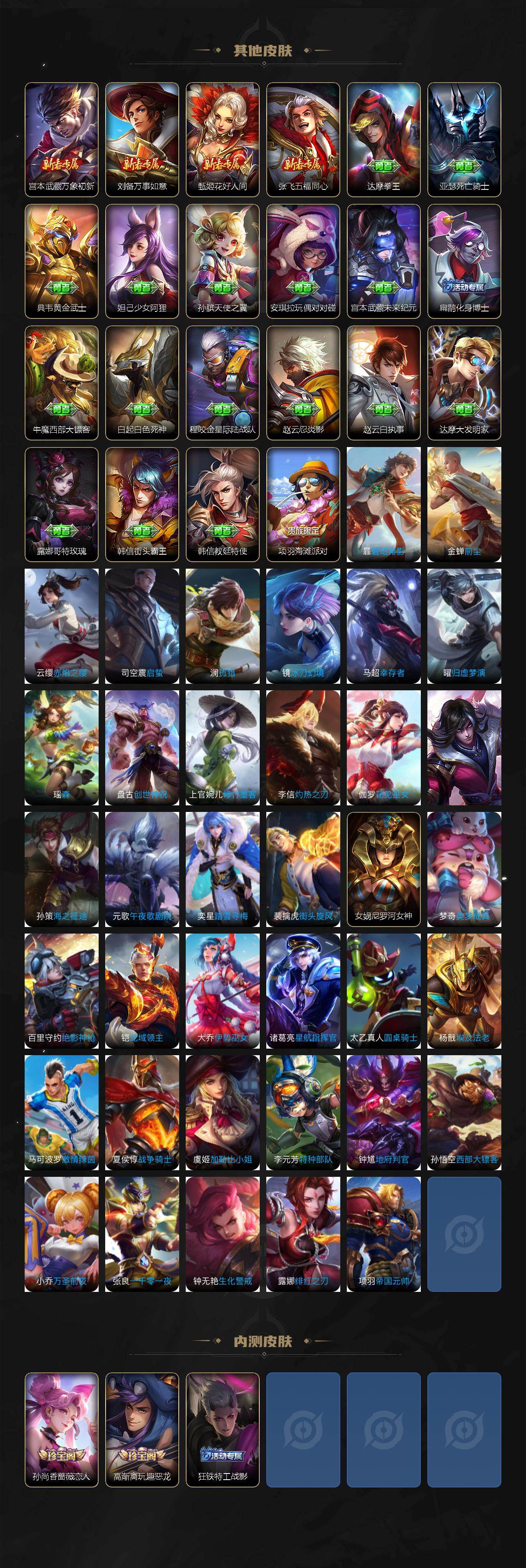 【限定皮肤】:姜子牙天穹之誓,狄仁杰阴阳师,赵云皇家上将,孙尚香蔷薇恋人,高渐离玩趣恶龙,元歌无心,达摩沙漠行僧,项羽海滩派对,兰陵王金庭之子,李元芳云中旅人,鬼谷子五谷丰年,沈梦溪大漠名商,裴擒虎李小龙,裴擒虎擒涛扼浪,云中君纤云弄巧,嫦娥拒霜思,鲁班大师探海