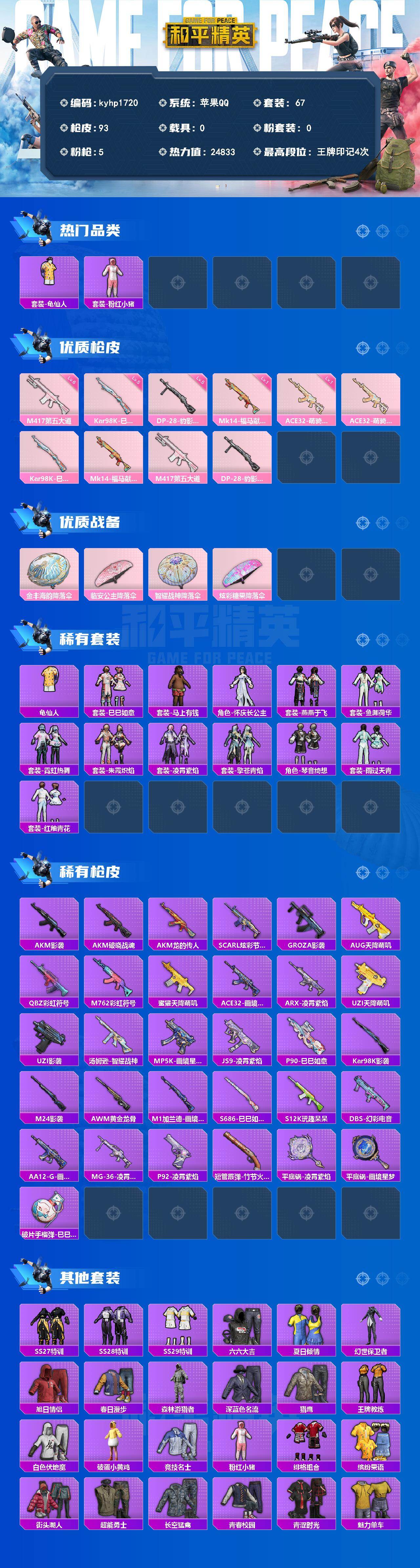 苹果 手Q-0粉装-5特效枪-0载具-0粉色飞行器-24833热力值-4王牌印记-67套装-93枪皮