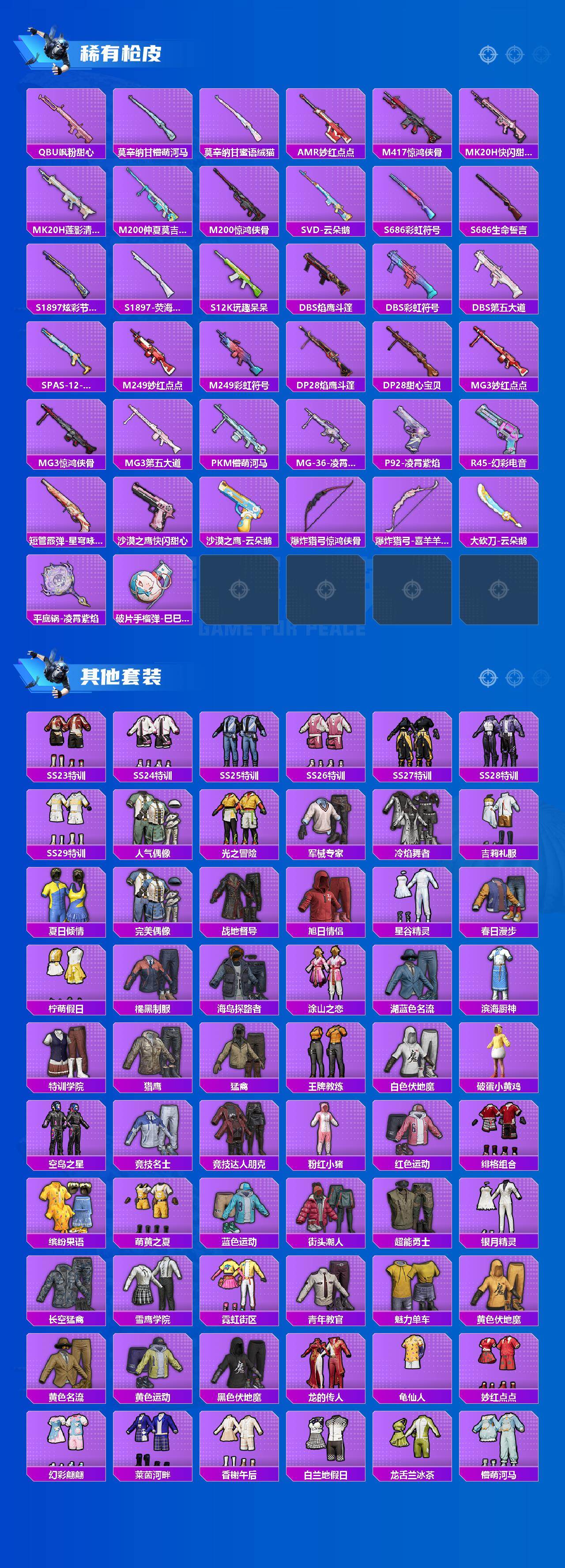 【粉色枪皮等级】:SCAR-L-锦绣绵绵(五级),ACE32-萌骑漫游(五级),Kar98K-巳巳如意(五级),Mk14-福马献瑞(一级),M417-第五大道(七级),DP-28-豹