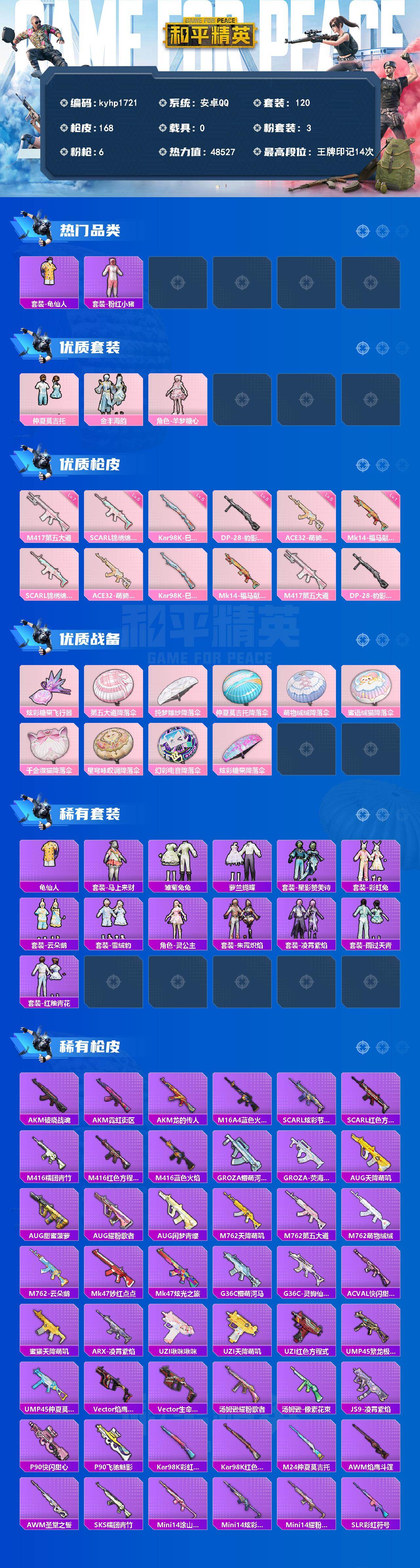 安卓 手Q-3粉装-6特效枪-0载具-1粉色飞行器-48527热力值-14王牌印记-120套装-168枪皮