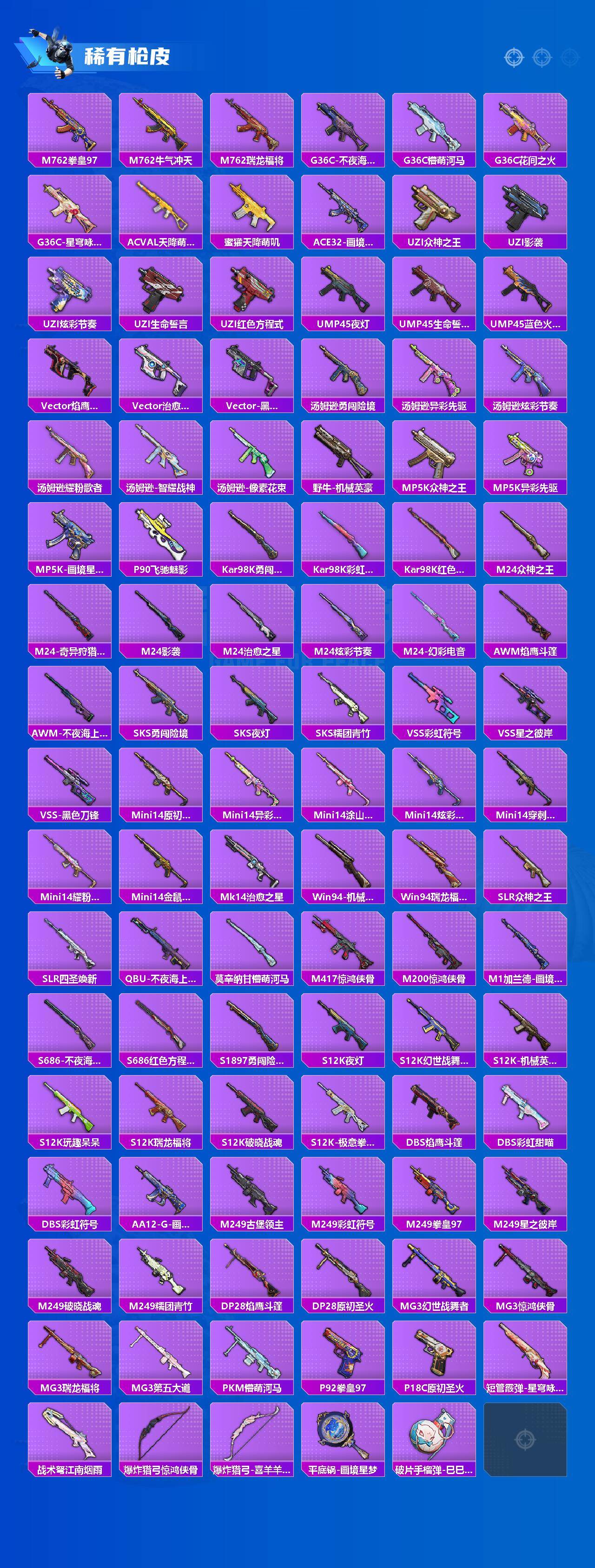 【粉色枪皮等级】:M416-心之恋语(七级),AUG-星之彼岸(四级),AUG-暖羊咩咩(五级),UMP45-量子极限(五级),AKS-74U-森灵之息