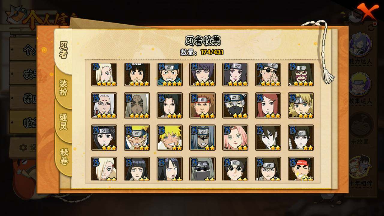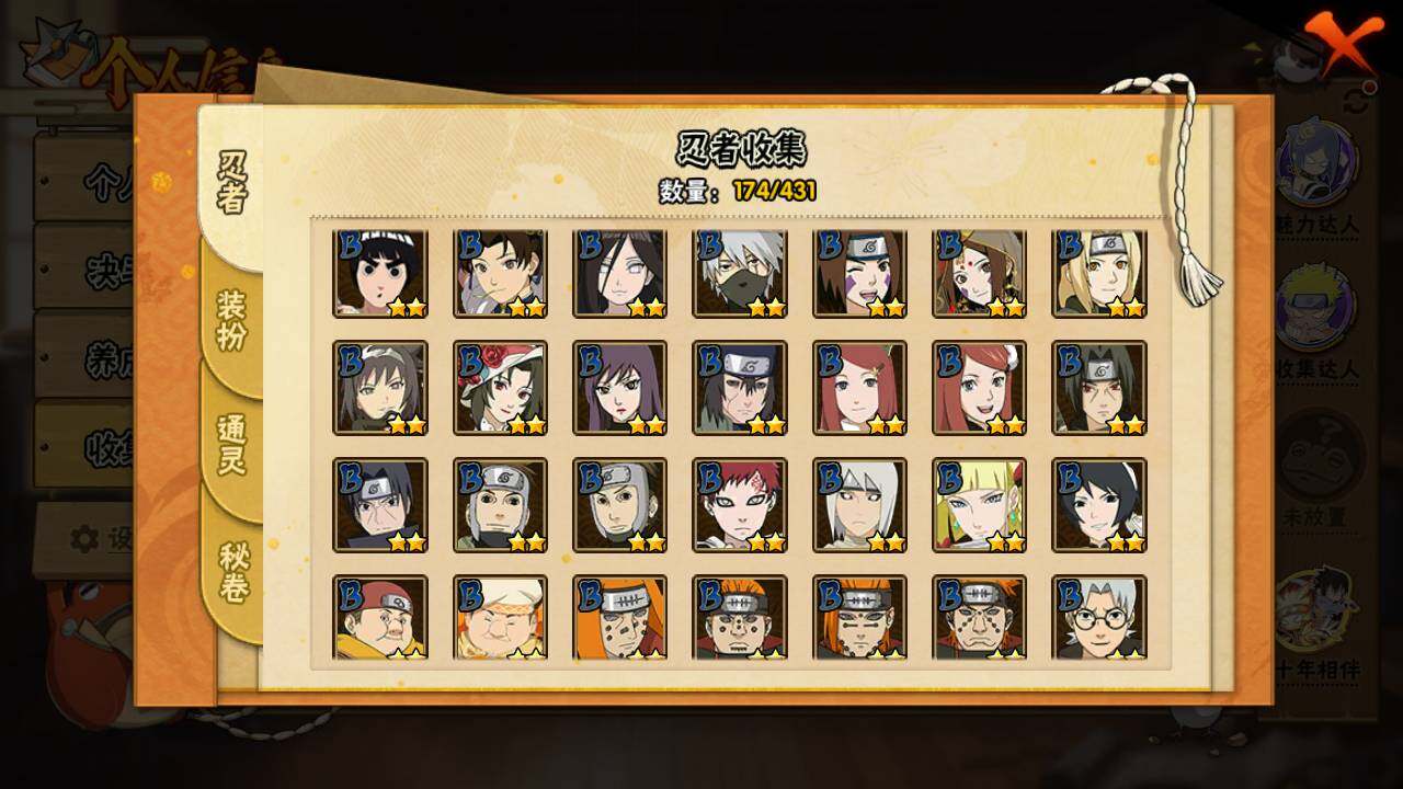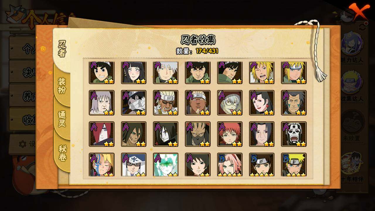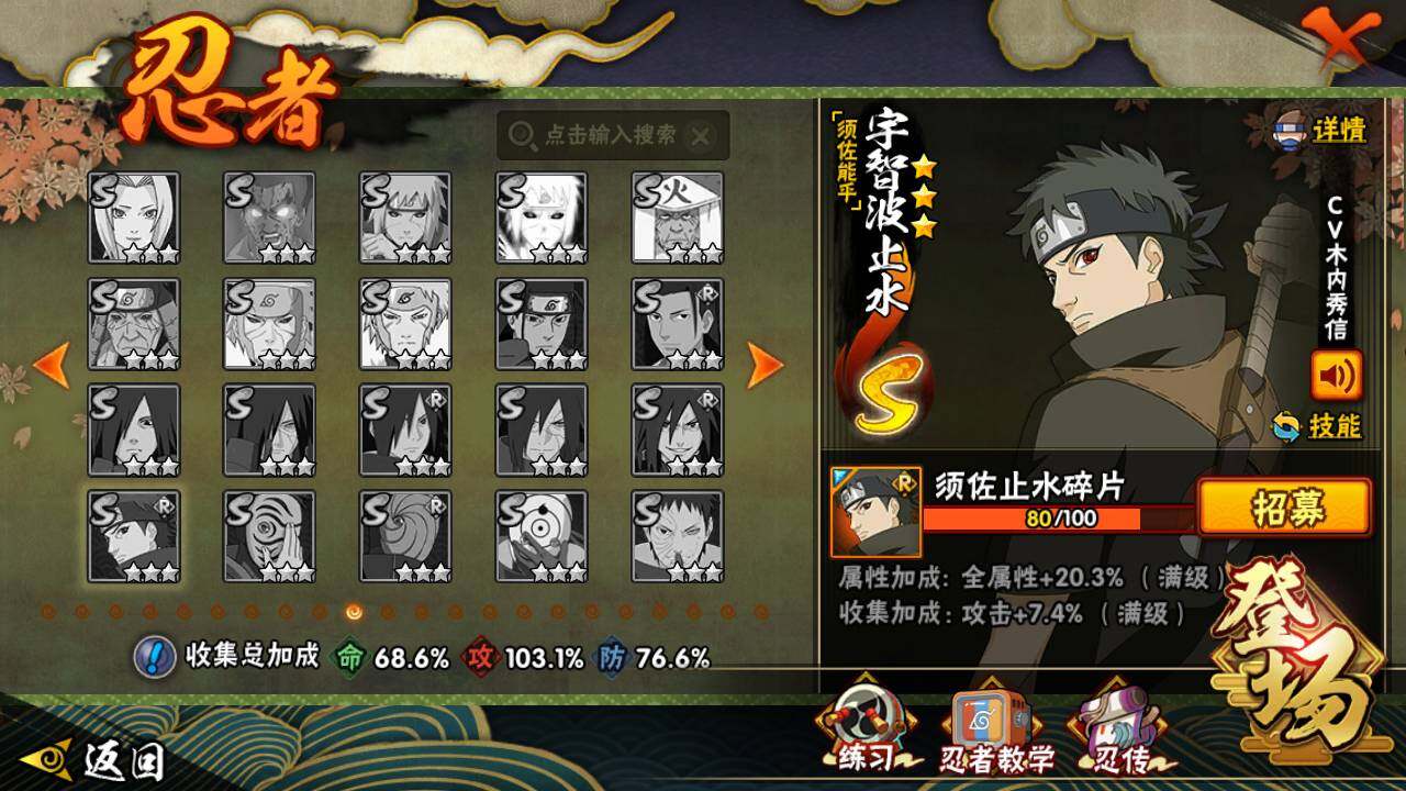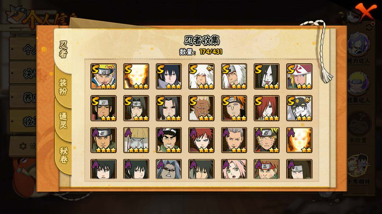 【S级忍者】:长门「秽土转生」(3星),千手柱间「秽土转生」(3星),宇智波鼬「秽土转生」(3星),艾「忍界大战」(3星),宇智波鼬「须佐能乎」(3星),自来也「舞之豪杰」(3星),大蛇丸(3星),自来也「传说中的三忍」(3星),波风水门(3星),漩涡鸣人