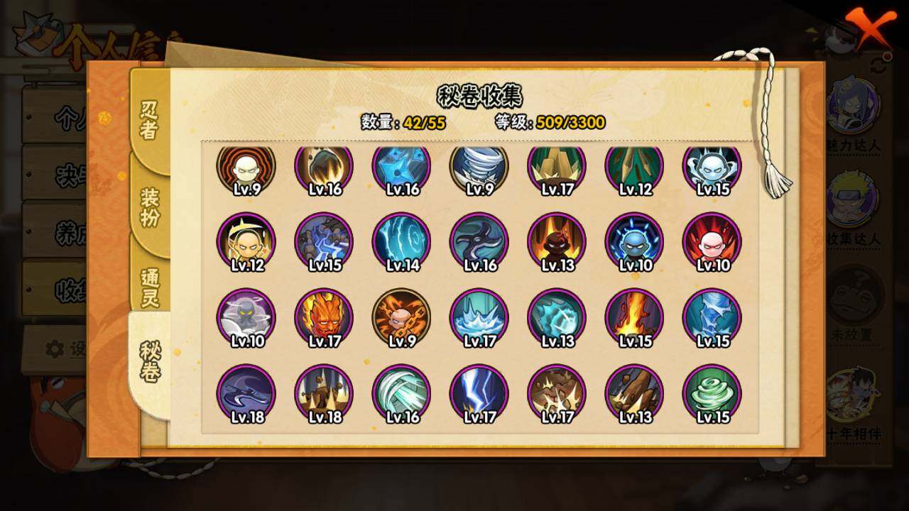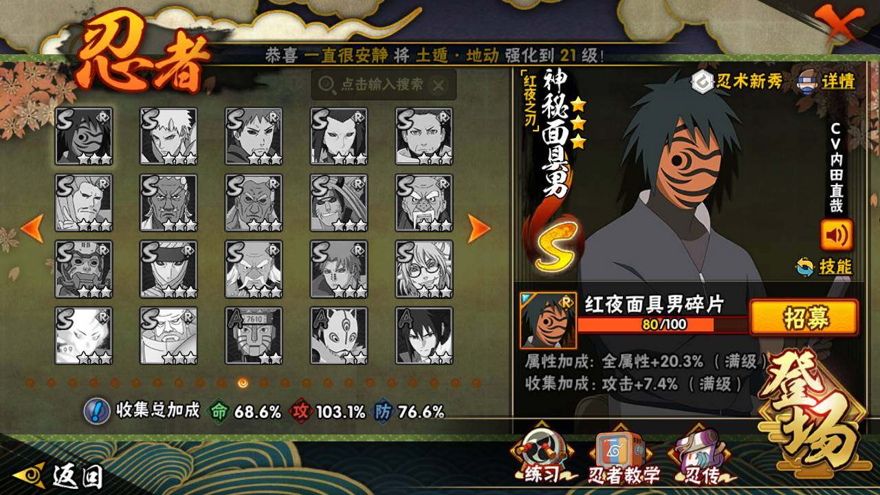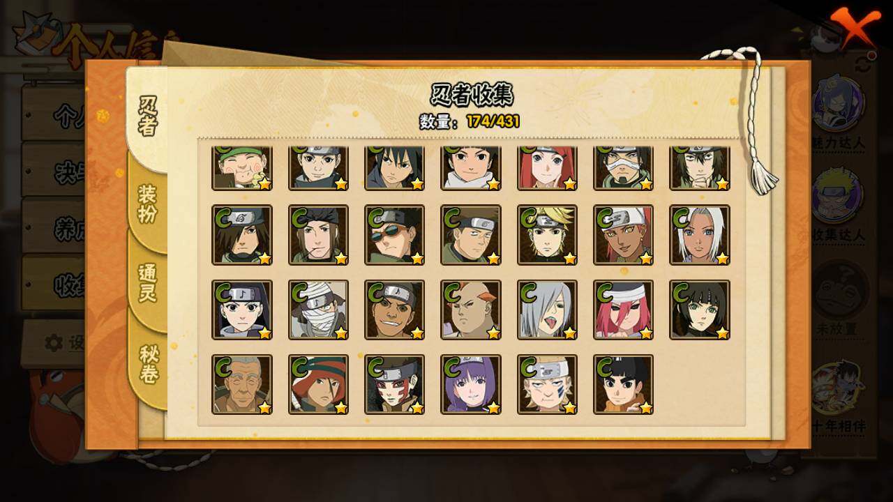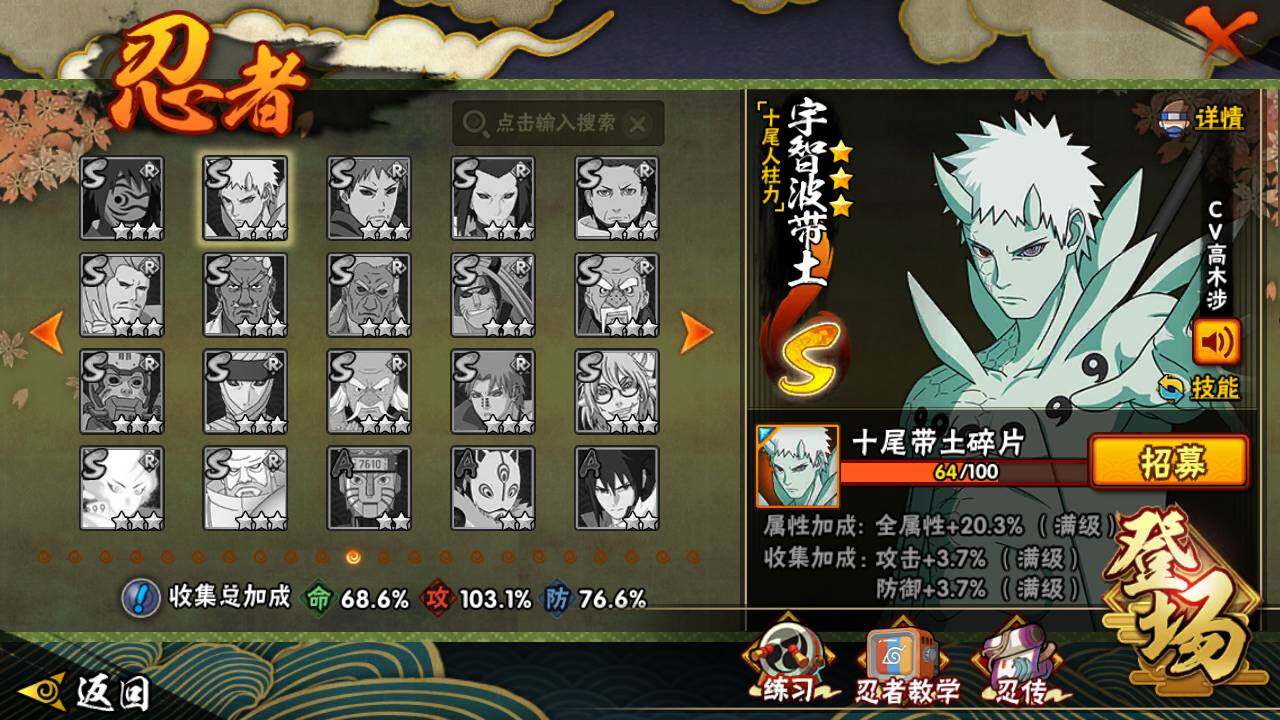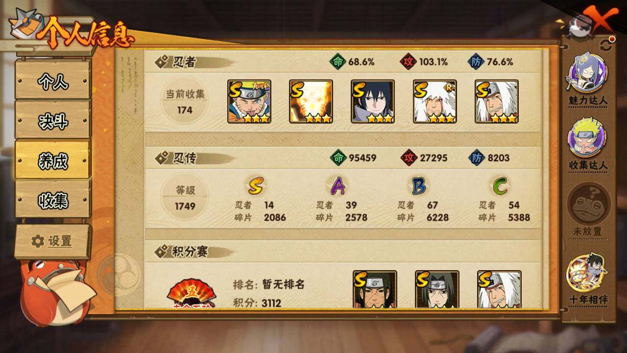 【S级忍者】:长门「秽土转生」(3星),千手柱间「秽土转生」(3星),宇智波鼬「秽土转生」(3星),艾「忍界大战」(3星),宇智波鼬「须佐能乎」(3星),自来也「舞之豪杰」(3星),大蛇丸(3星),自来也「传说中的三忍」(3星),波风水门(3星),漩涡鸣人