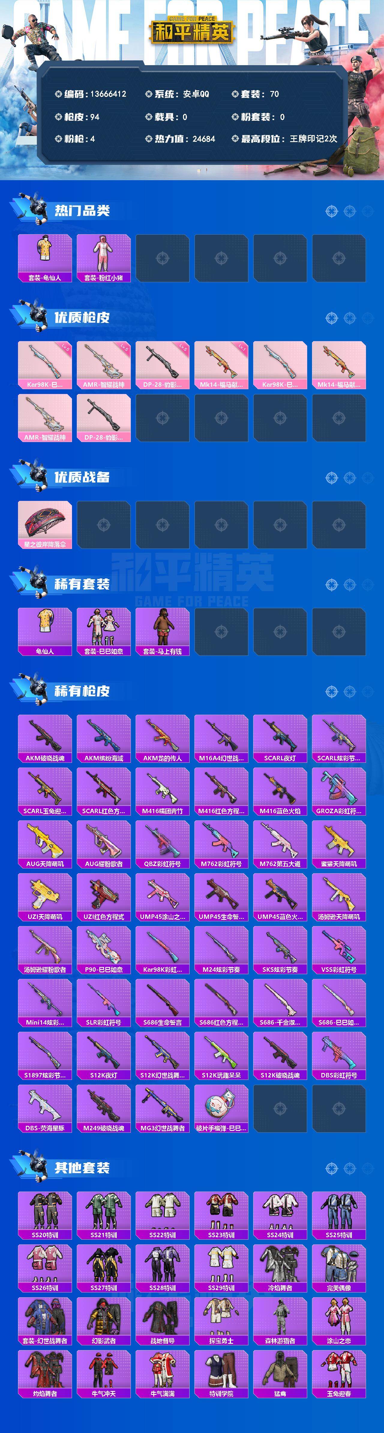 70套装/枪械4/装备80/战备69/王牌印记2/热力值24684/五级Kar98K-巳巳如意/一级Mk14-福马献瑞/五级AMR-智耀战神/五级DP-28-豹影疾电/套装-龟仙人/套装-粉红小猪/Kar98K-巳巳如意/Mk14-福马献瑞/AMR-智耀战神/DP-28-豹影疾电/星之彼岸降落伞/龟仙人/巳巳如意/套装-马上有钱/AKM-破晓战魂/AKM-缤纷海域/AKM-龙的传人/M16A4-