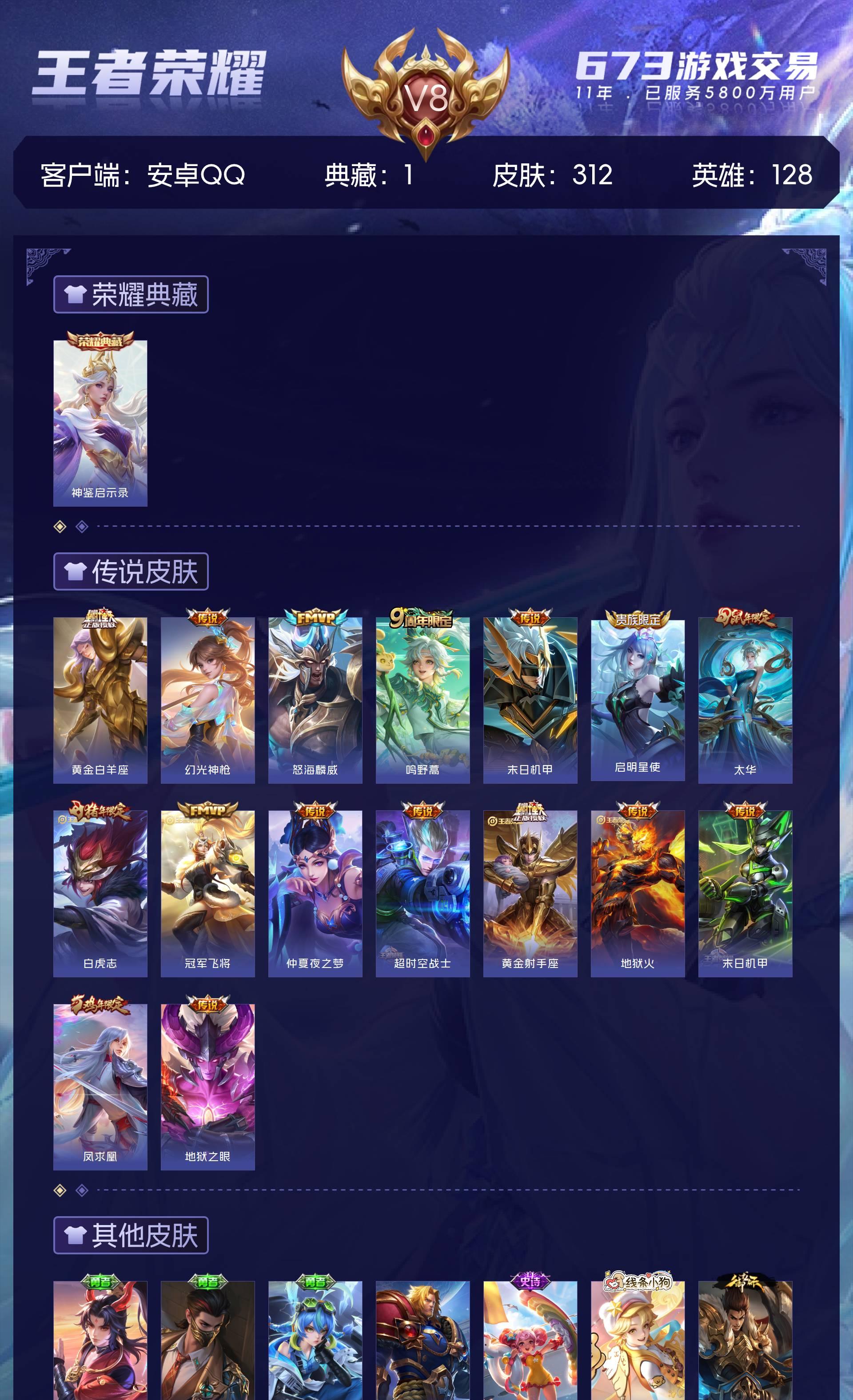 V8 皮肤312 英雄128 尊贵铂金 荣耀典藏1 传说16