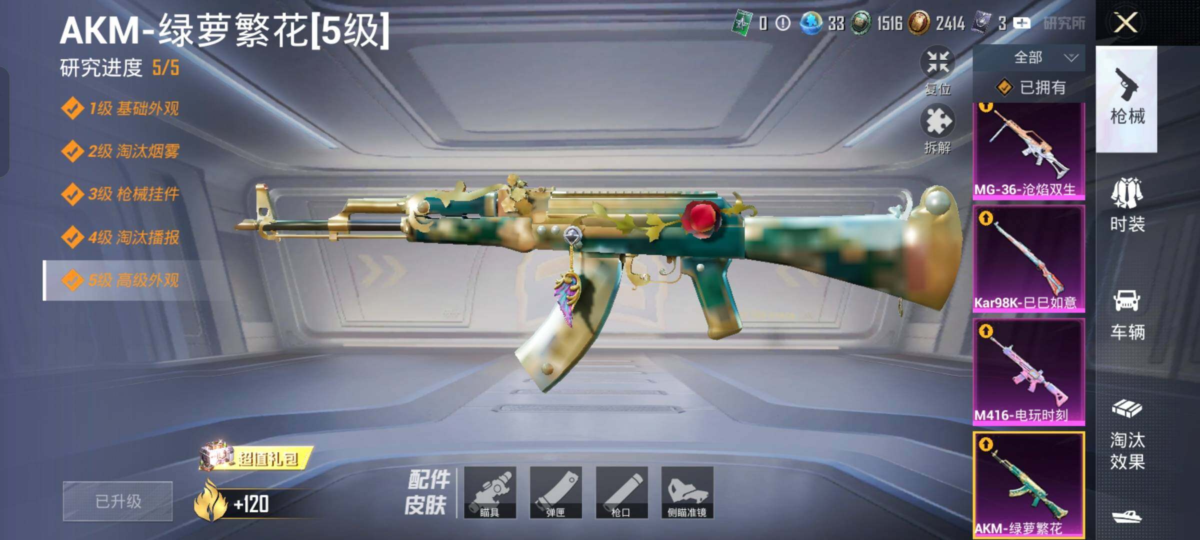 【4特效枪】 Kar98K-巳巳如意 (5级) MG-36-虹云熊熊 (4级) DBS-幻影飞狐 (7级) Mk14-福马献瑞 (4级)