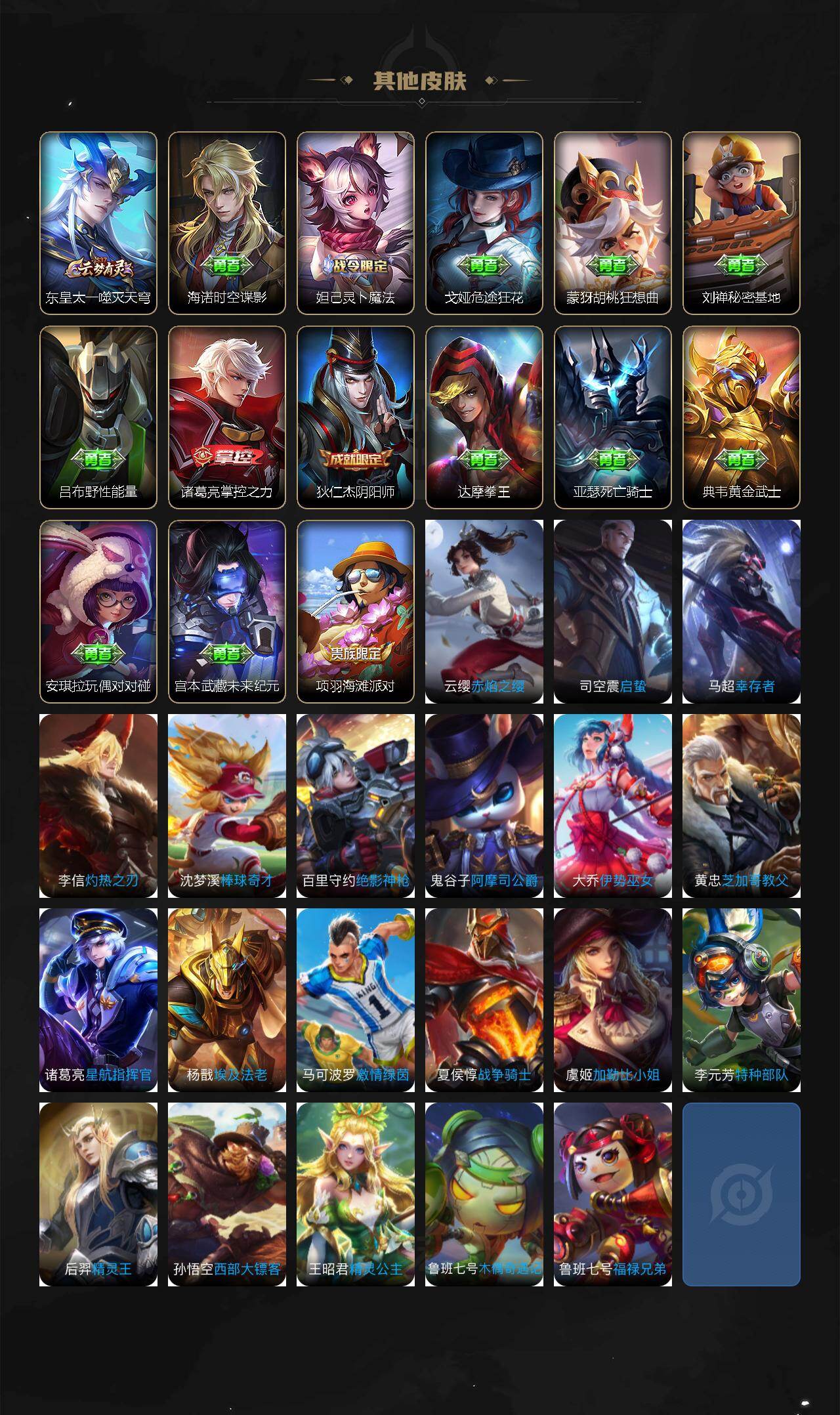【传说皮肤】:后羿神树通天,司空震愿照山河定,桑启鸣野蒿,夏侯惇霜北刀,典韦战鼓燎原,孙策末日机甲,镜炽阳神光,后羿黄金射手座,孙尚香末日机甲