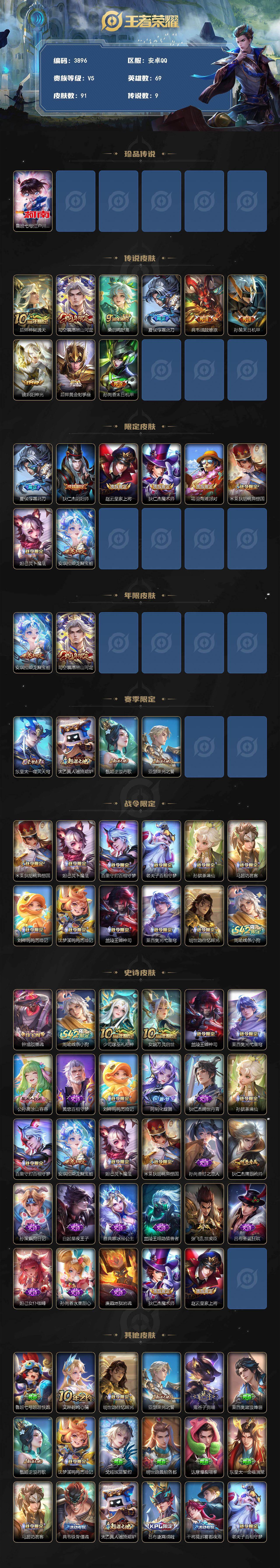 安卓Q-V5-至尊星耀IV段位-69英雄-91皮肤-1珍品传说-9传说-27史诗