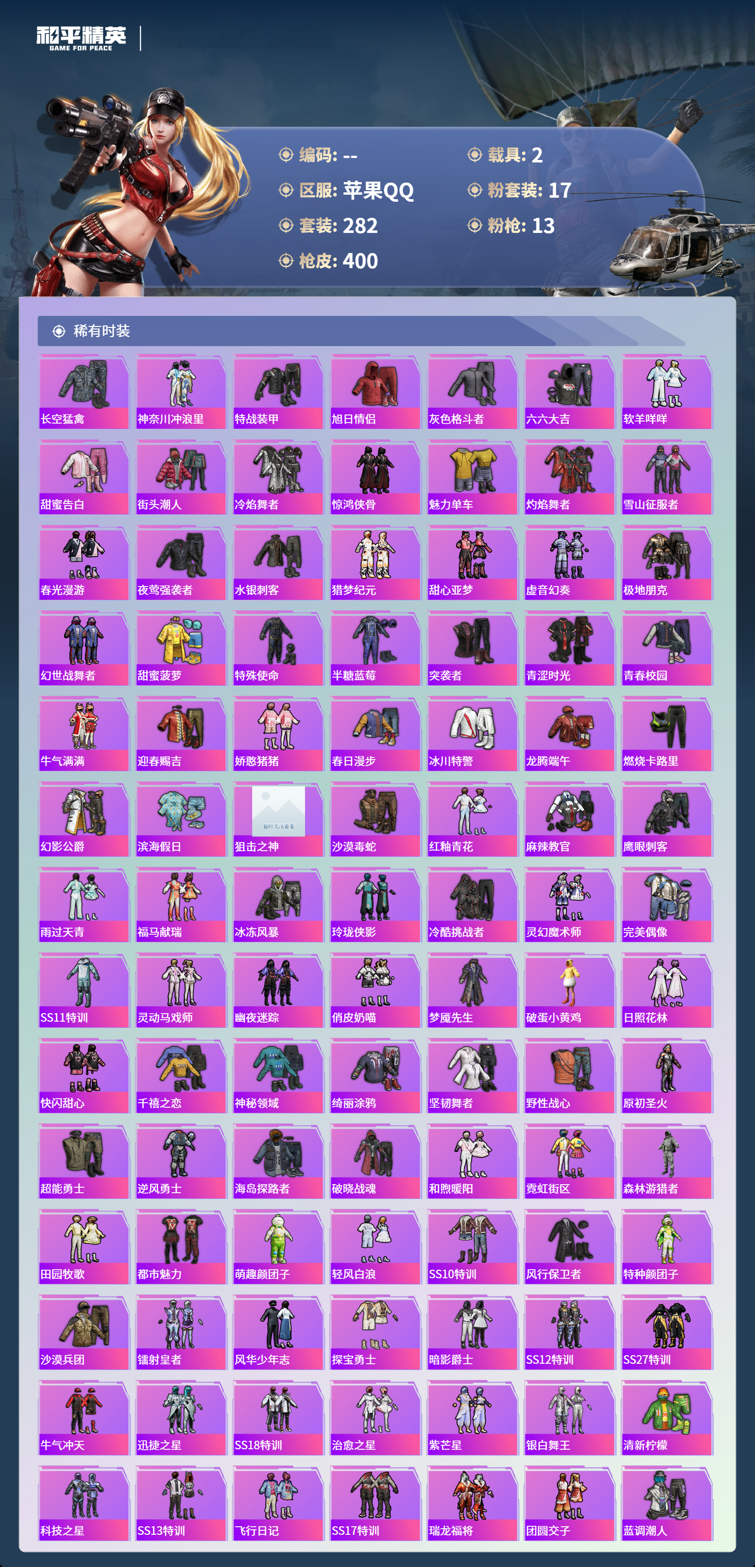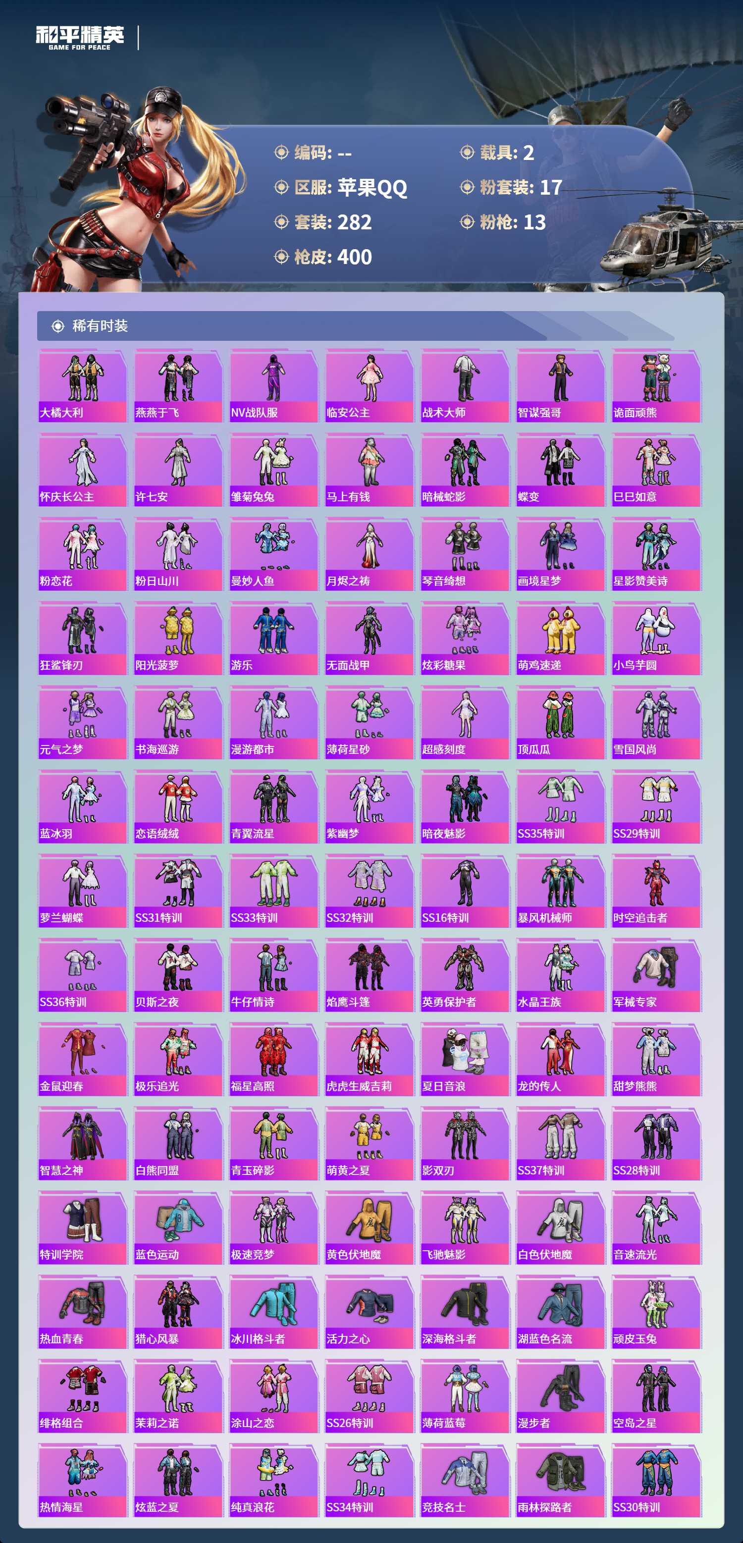 苹果手Q-20王牌印记-1红装-17粉装-13特效枪-2载具-热力