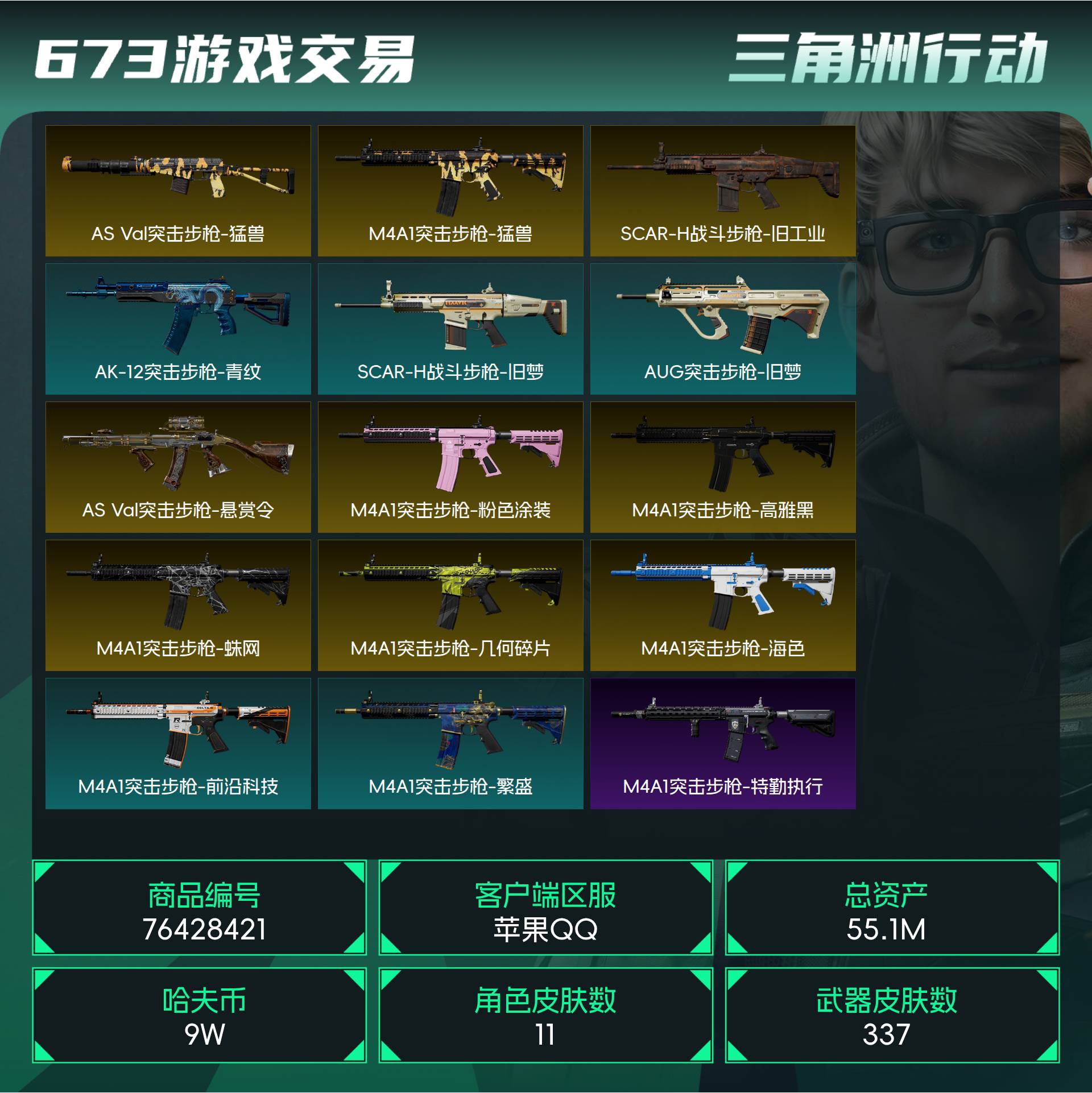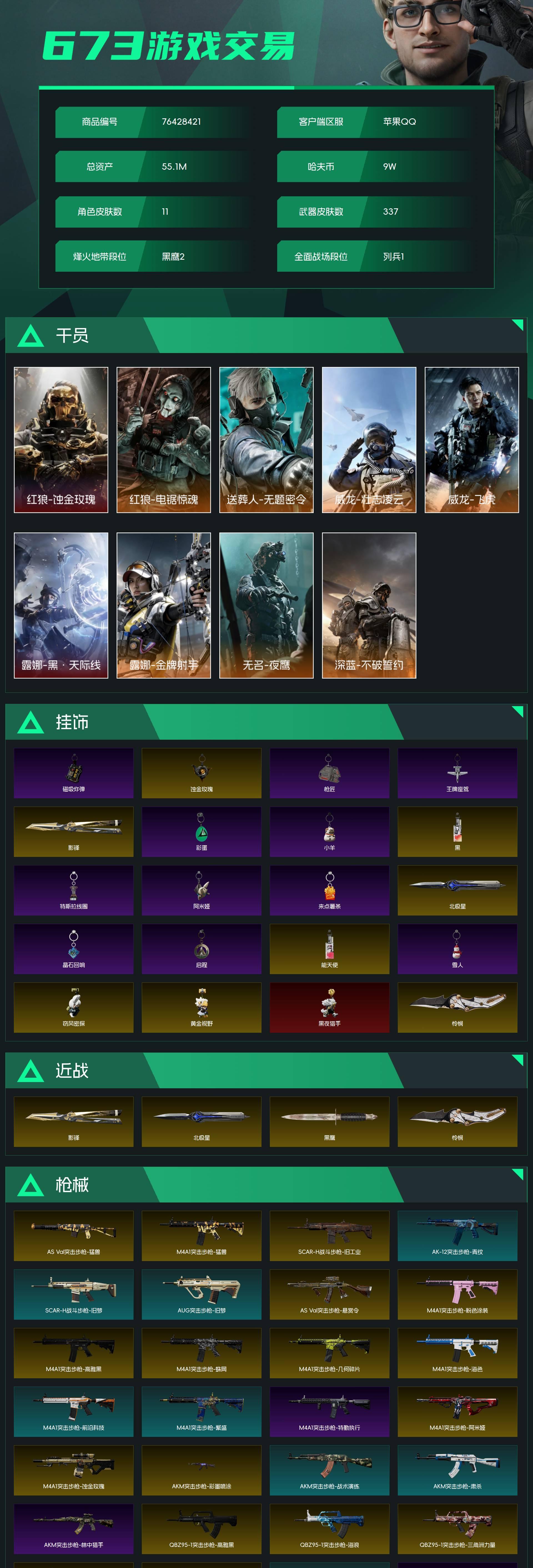烽火段位黑鹰2 战场段位列兵1 总资产55.1M 哈夫币9W 干员11 挂饰32 近战5 枪械337