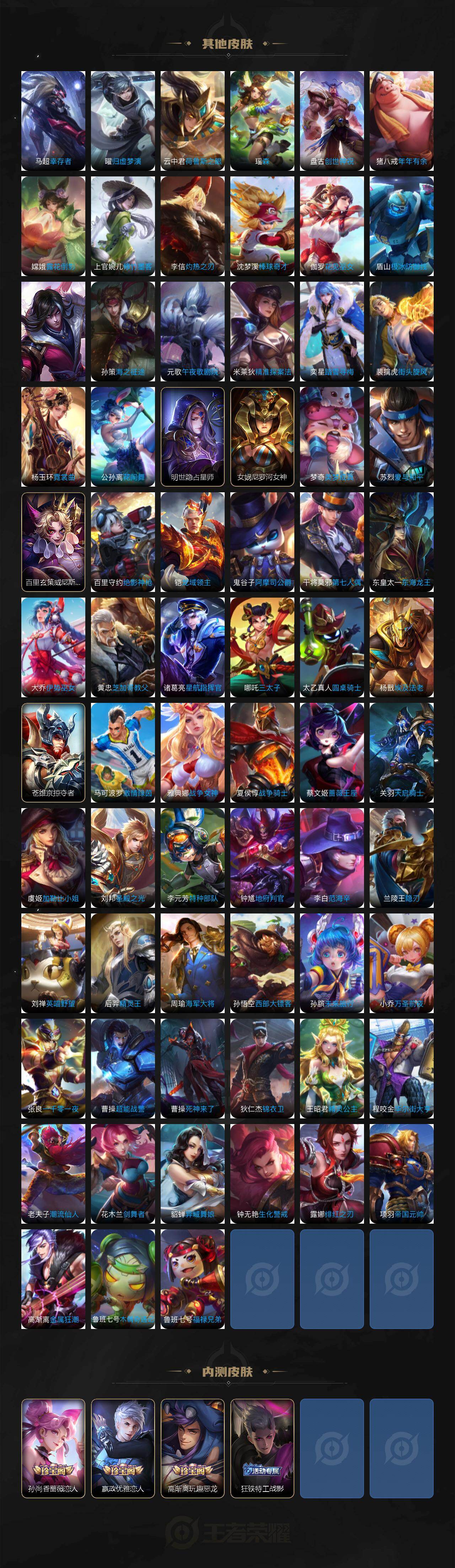 【英雄全皮】:扁鹊全皮,孙权全皮,橘右京全皮,鬼谷子全皮,狂铁全皮,猪八戒全皮,敖隐全皮,阿古朵全皮,金蝉全皮,戈娅全皮,空空儿全皮,影全皮