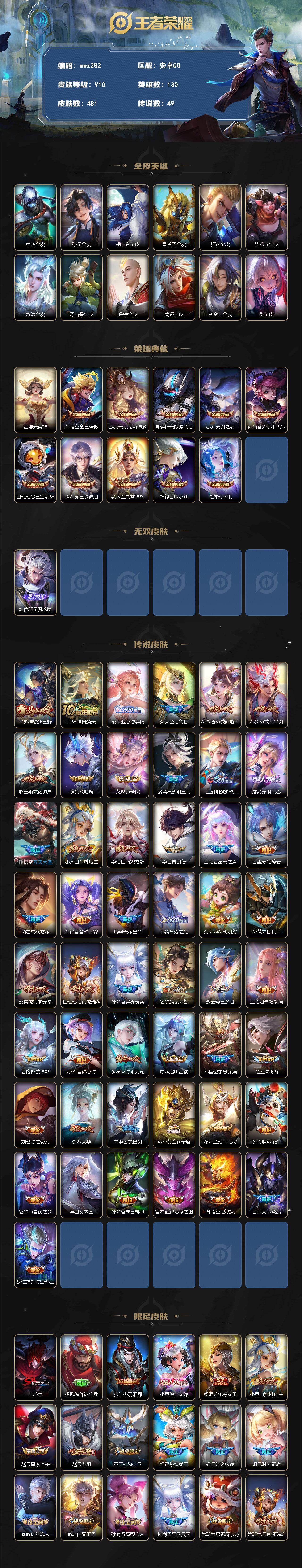 【mwz382】安卓Q-V10-最强王者段位-130英雄-481皮肤-10典藏皮肤-1典藏英雄-1无双-49传说-149史诗