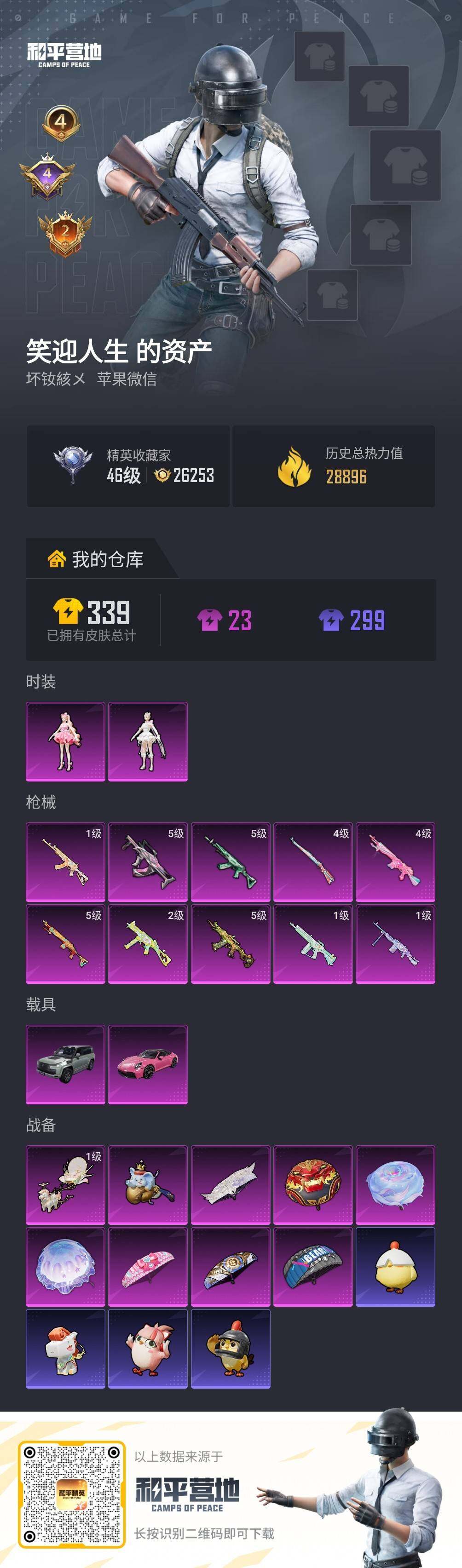 小女号!裙子号!苹果 微信-2粉装-10特效枪-2载具-2粉色飞行器-28896热力值-4王牌印记-75套装-82枪皮
