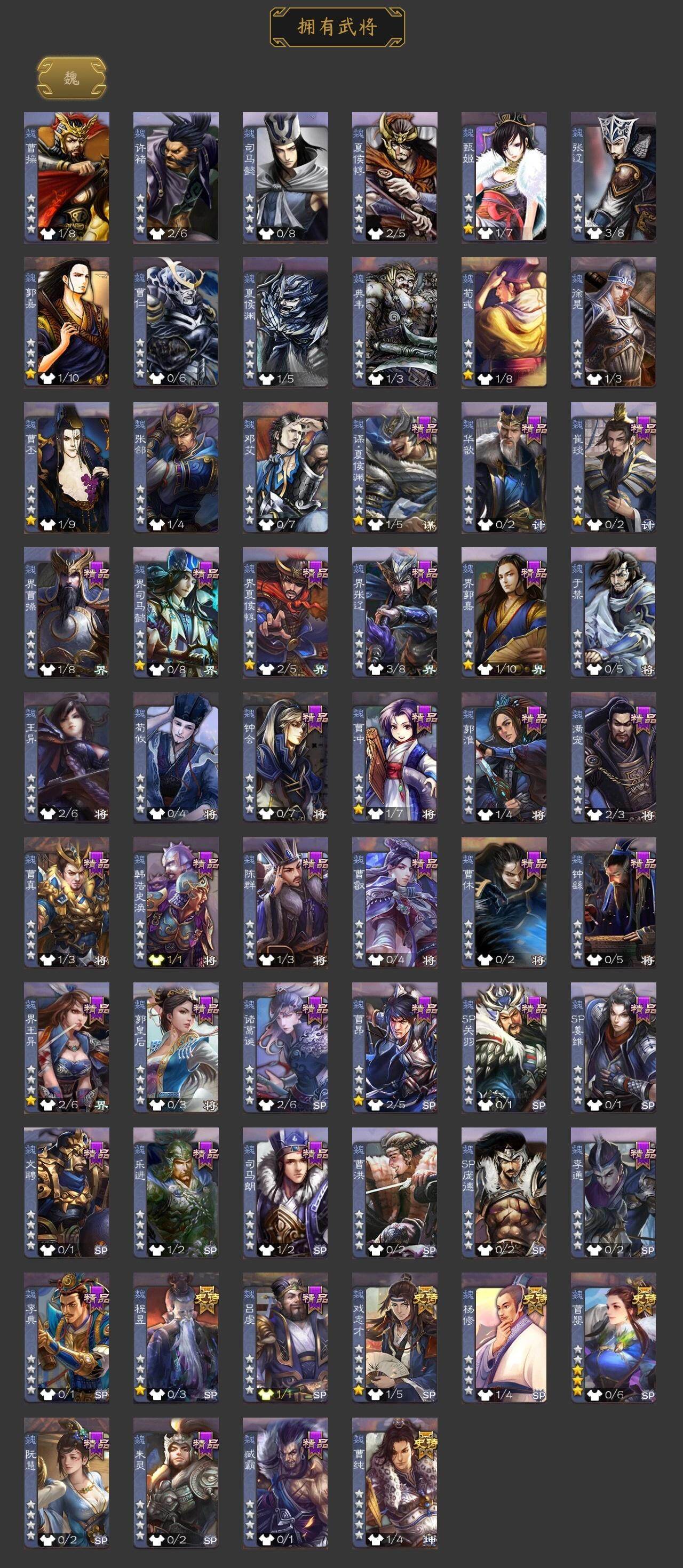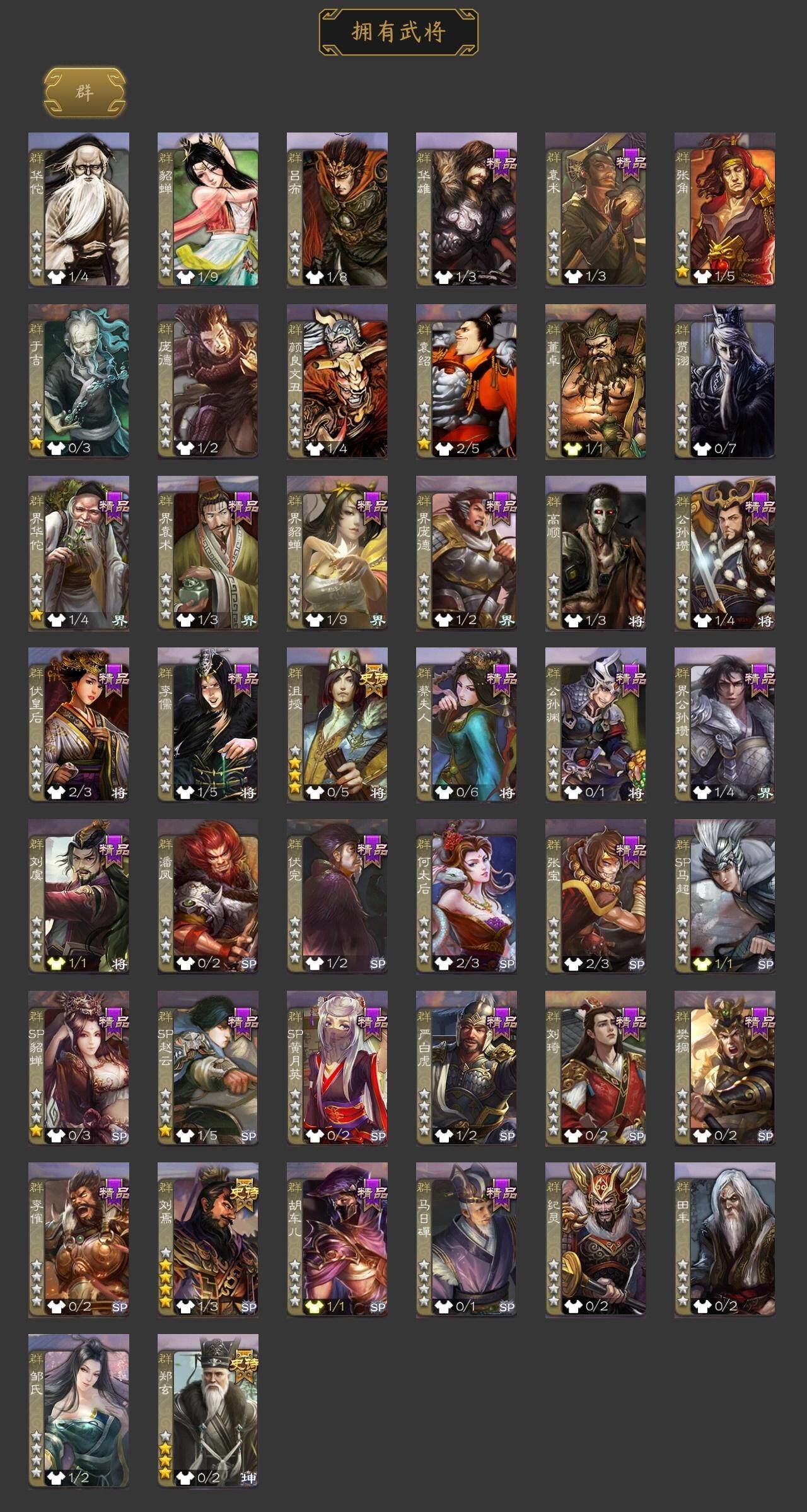 杨修,曹婴,曹纯,戏志才,程昱,关索,谋诸葛亮,谯周,界黄忠,周处,郑玄,刘焉,沮授,SP关羽,乐进,曹昂,诸葛诞,朱灵,文聘,SP姜维,钟会,曹冲,郭淮,满宠,界王异,界曹操,界司马懿,