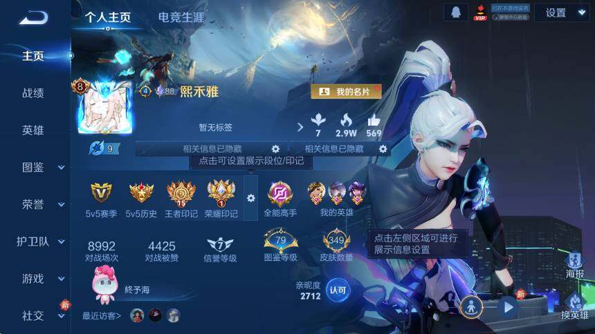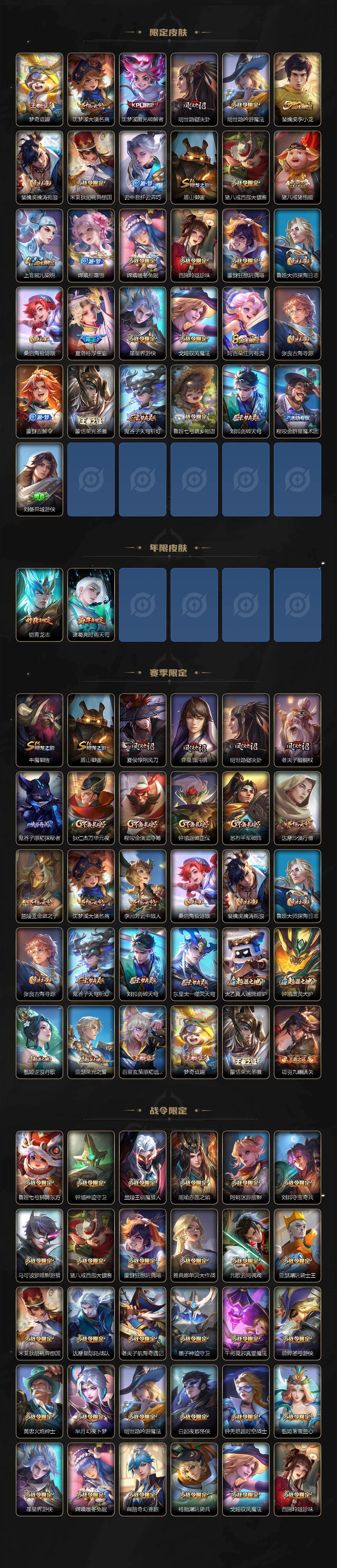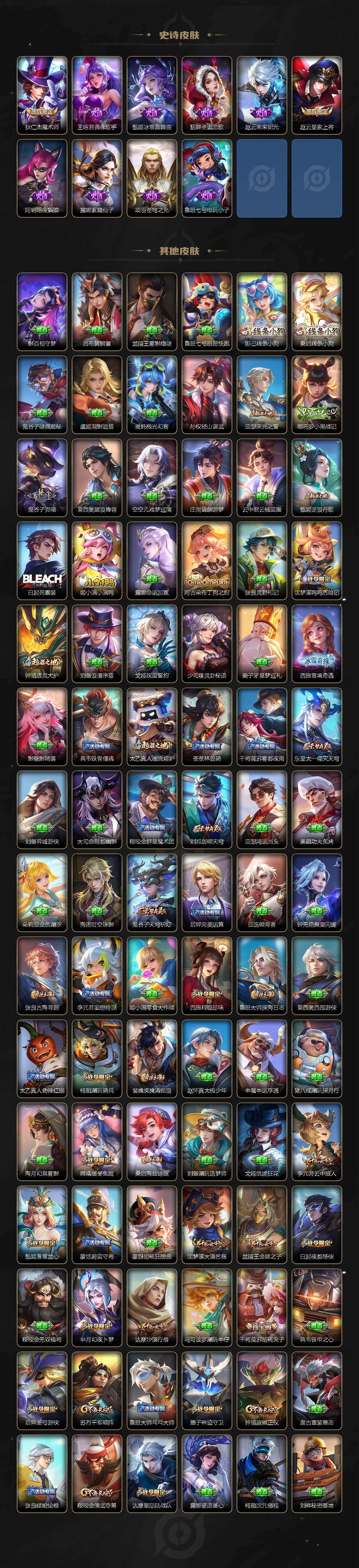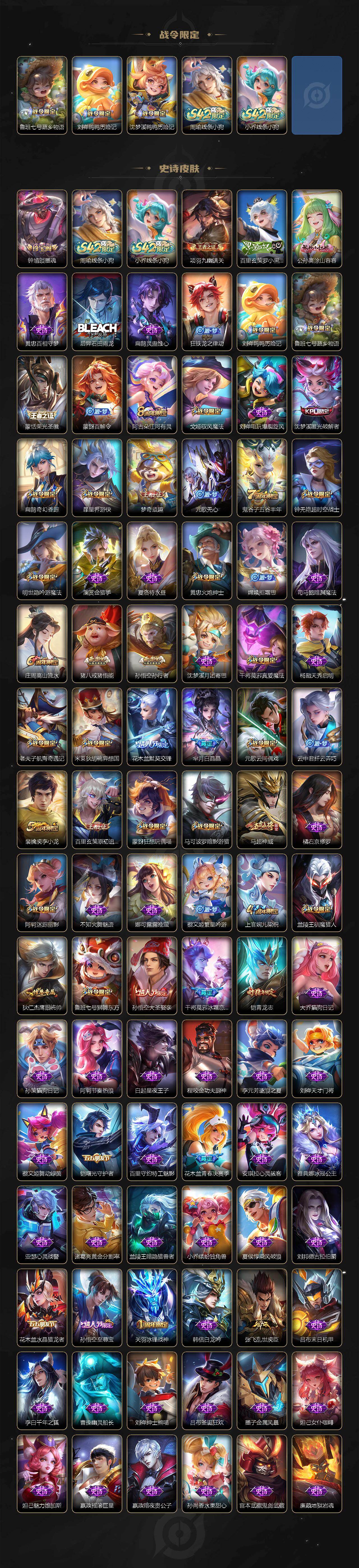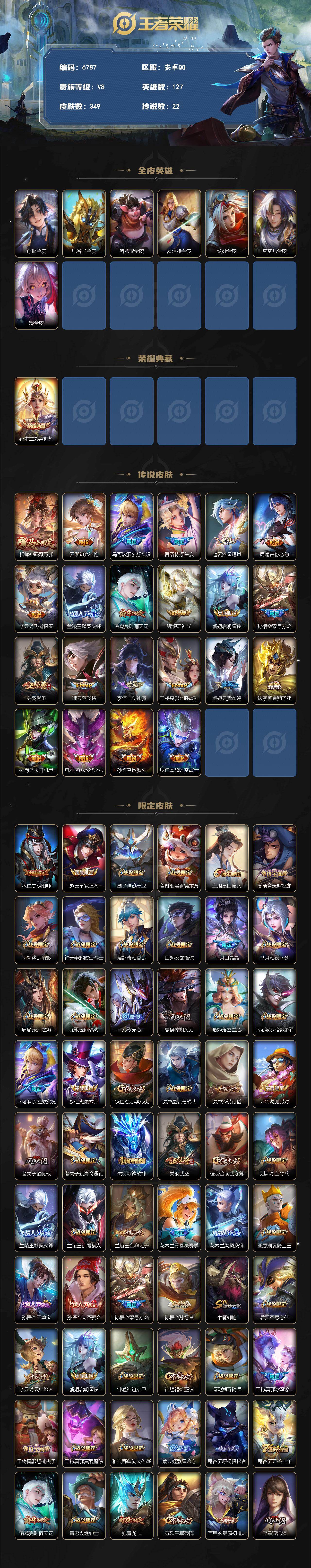 贵族等级8/荣耀典藏数量1/传说皮肤数量22/史诗皮肤数量105/皮肤数量349/英雄数量127/段位至尊星耀/孙权全皮/鬼谷子全皮/猪八戒全皮/夏洛特全皮/戈娅全皮/空空儿全皮/影全皮/九霄神辉 花木兰/貂蝉神骥聚万邦/幻光神枪 云缨/妄想实况 马可波罗/浮生妄 夏洛特/淬星耀世 赵云/音你心动 周瑜/飞鸢探春 李元芳/默契交锋 兰陵王/时雨天司 诸葛亮/炽阳神光 镜/启明星使 虞姬/零号·