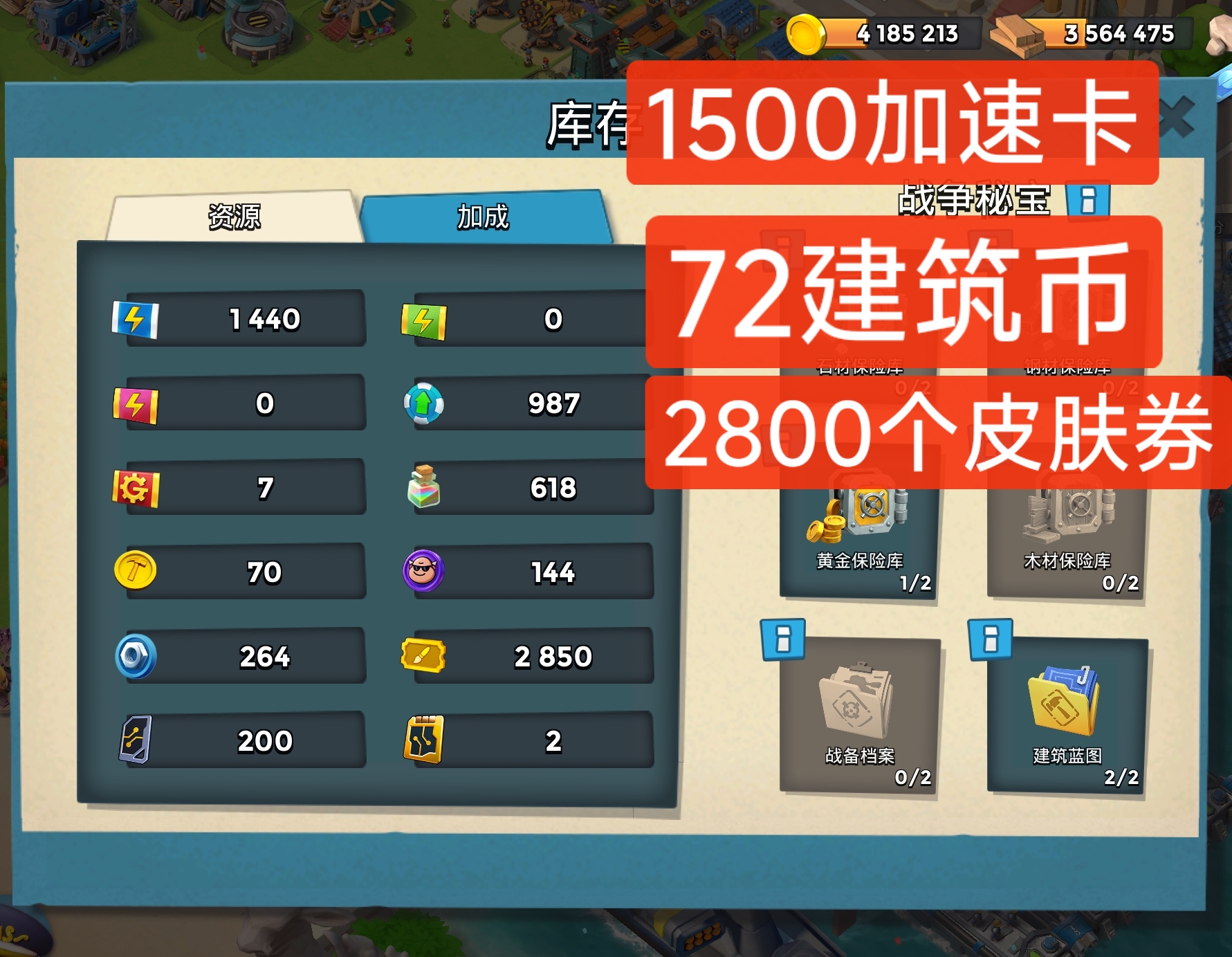 建筑币72个,加速卡1500个