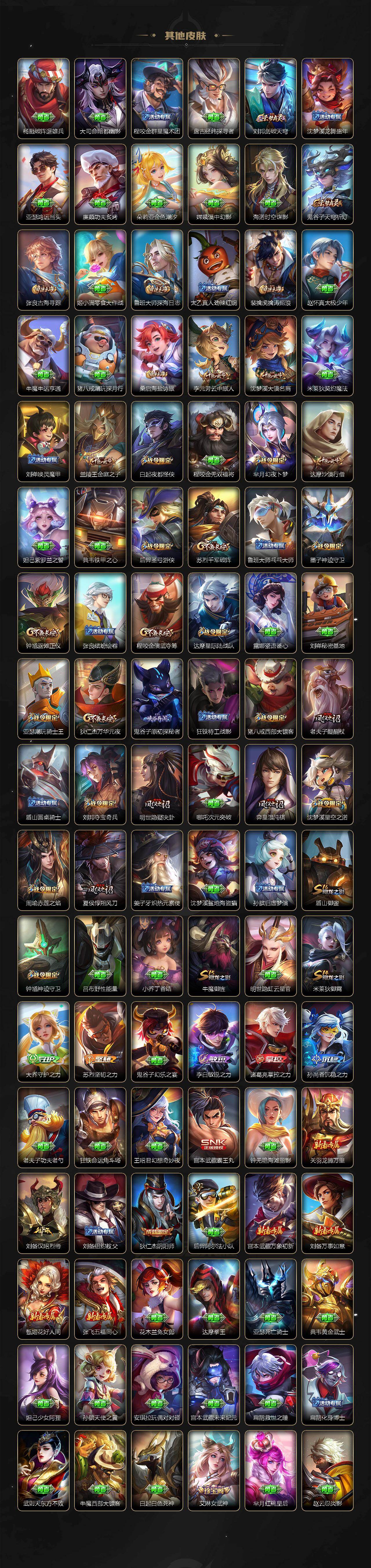 【传说皮肤】:马超神骥逐星野,澜愿照九州拓,裴擒虎祥瑞亨通,桑启鸣野蒿,马超琥珀纪元,铠琥珀纪元,澜逐花归海,孙悟空齐天大圣,鲁班七号寅