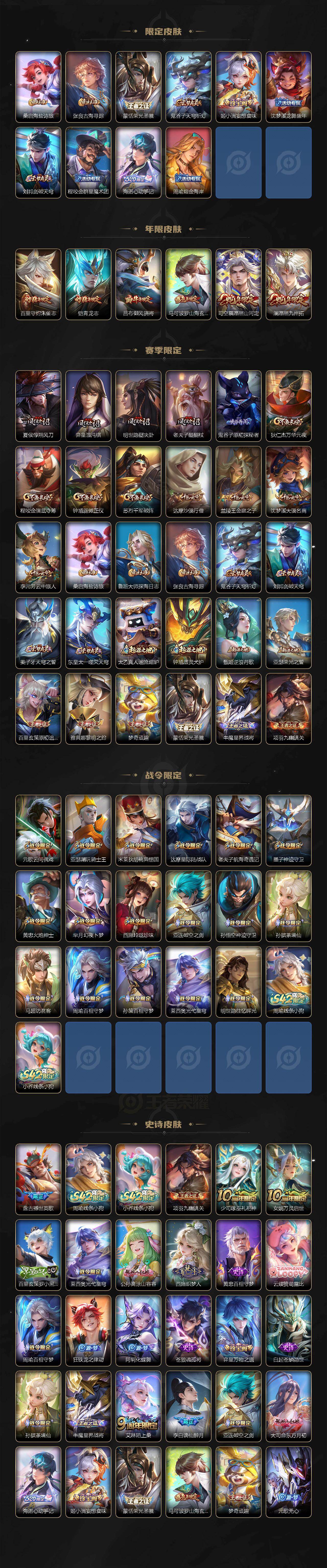 贵族等级8/荣耀典藏数量1/传说皮肤数量20/史诗皮肤数量94/皮肤数量306/英雄数量127/段位最强王者/孙权全皮/苍全皮/敖隐全皮/蒙恬全皮/空空儿全皮/影全皮/海诺全皮/最初的交响 伽罗/孙悟空无相/云缨神骥越千峰/千山共赴 干将莫邪/九山相柳 司马懿/愿照·山河定 司空震/愿照·九州拓 澜/祥瑞亨通 裴擒虎/鸣野蒿 桑启/灼幽烈阳 东皇太一/鹤羽星尊 诸葛亮/画中仙 干将莫邪/诗剑行