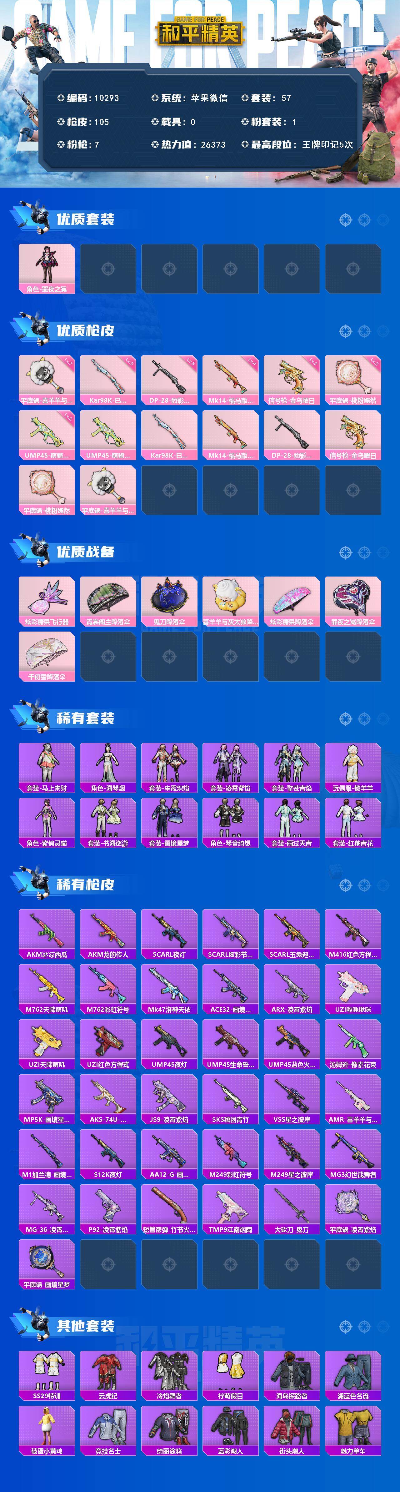苹果 微信-1粉装-7特效枪-0载具-1粉色飞行器-26373热力值-5王牌印记-57套装-105枪皮