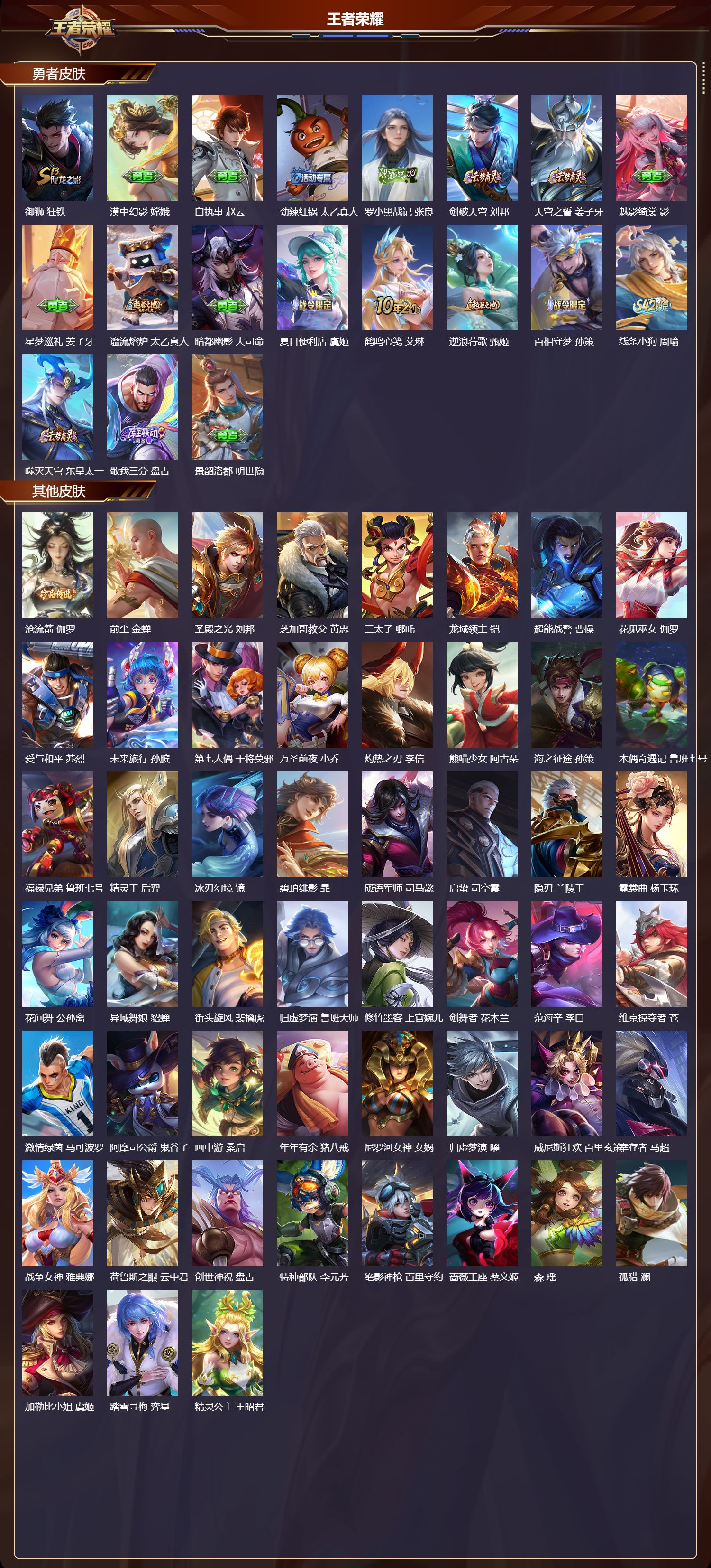 荣耀王者/282皮肤/128英雄/1典藏/0珍品无双/2无双/2珍品传说/18传说/77史诗/9稀有英雄