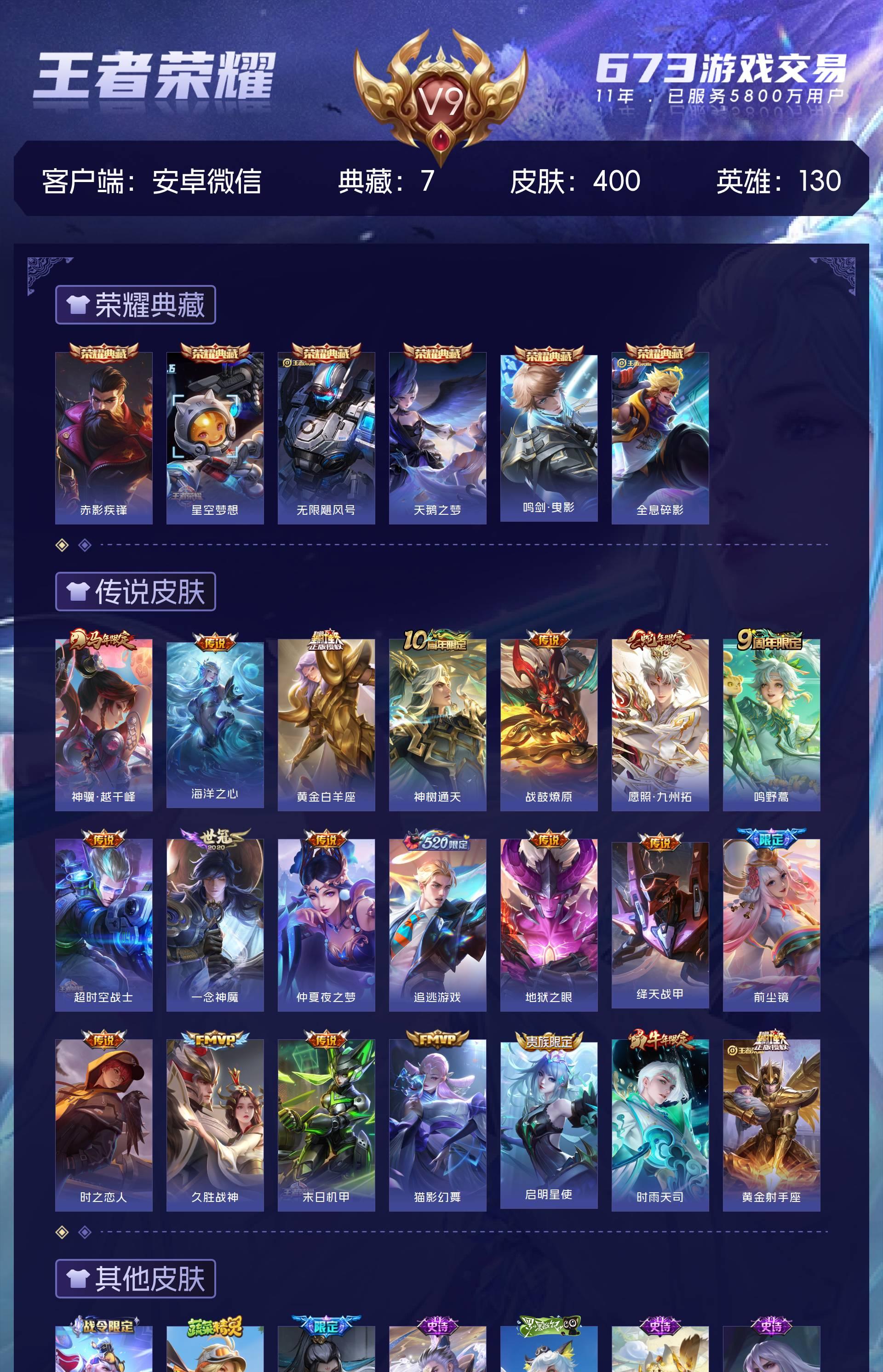 V9 皮肤400 英雄130 至尊星耀 荣耀典藏7 传说21