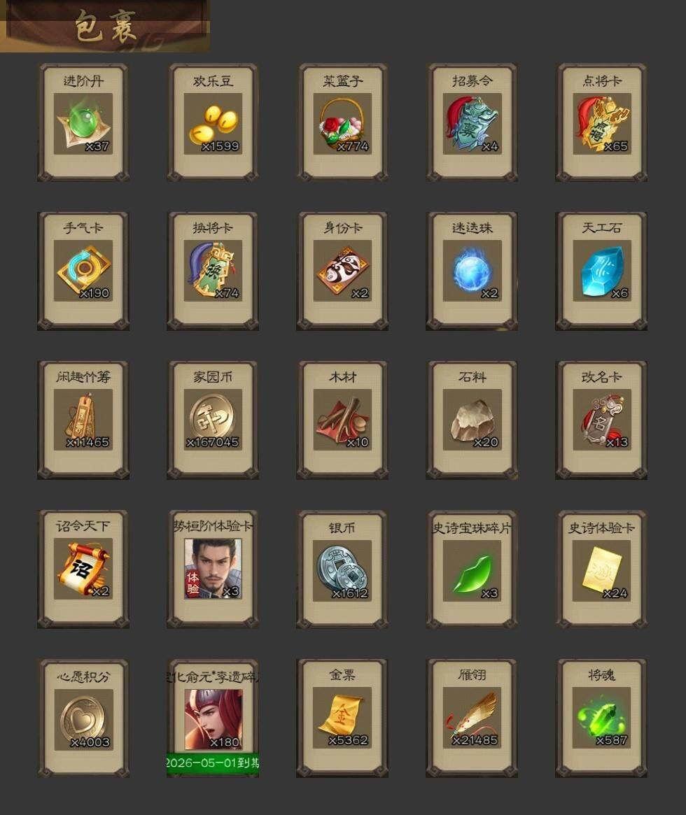官阶:领军将军;VIP等级:VIP6;史诗武将数量:8;动态皮肤数量:8;武将总数:224;史诗宝珠数量:0;将魂数量:587;神将:0;魏国史诗武将:8;蜀国史诗武将:1;吴国史诗武将:1;群史诗武将:1
